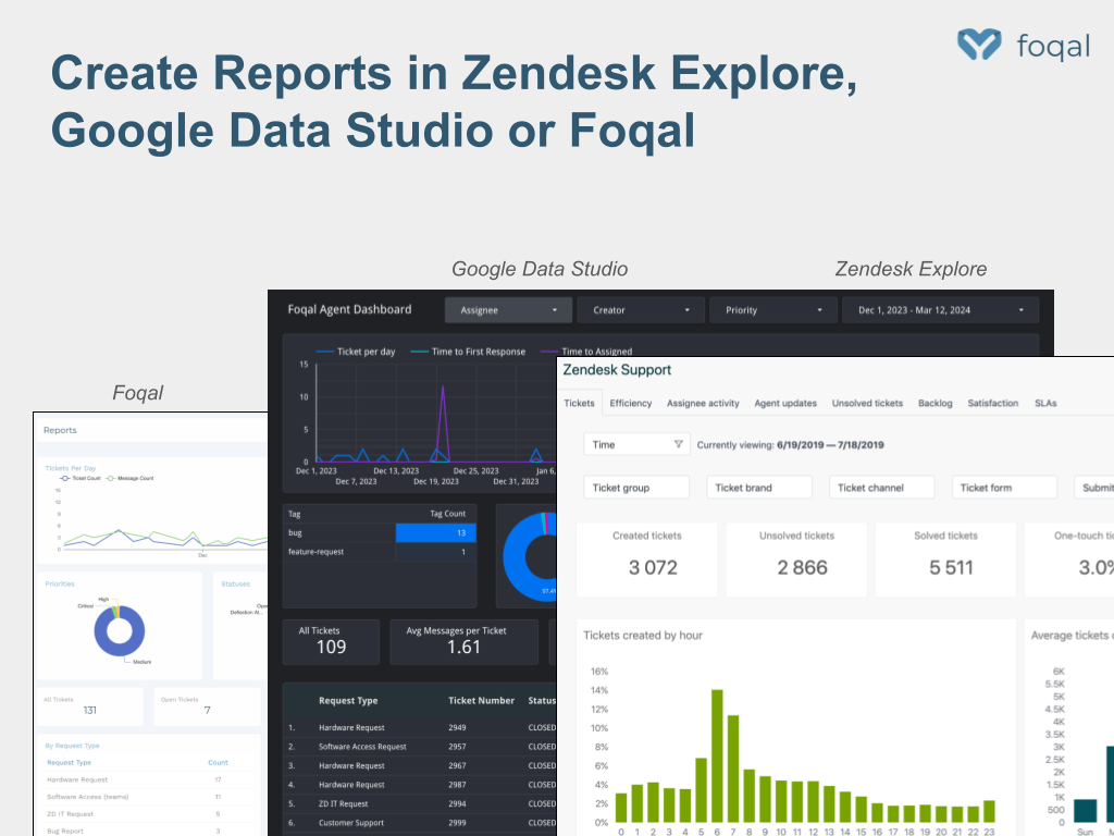 Analytics: Foqal lets you create reports to understand your team and customers in Zendesk Explore or Google Data Studio.