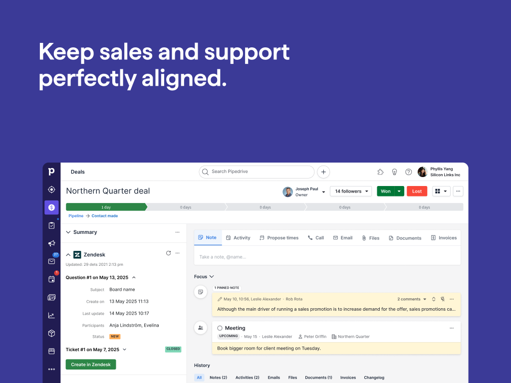 And Zendesk users can create deals directly from support tickets and view the following information from Pipedrive: