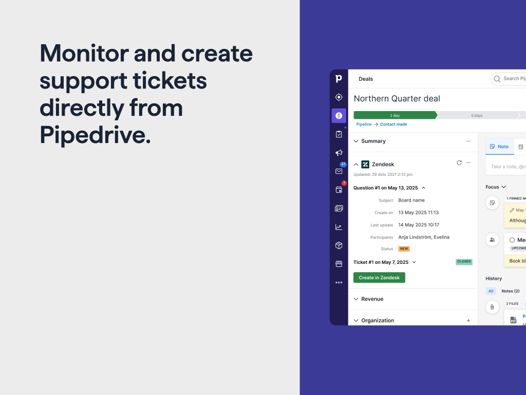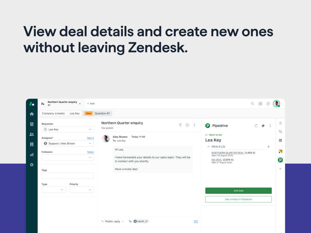 Sync Zendesk and Pipedrive to know who to contact and quickly create tickets or deals.