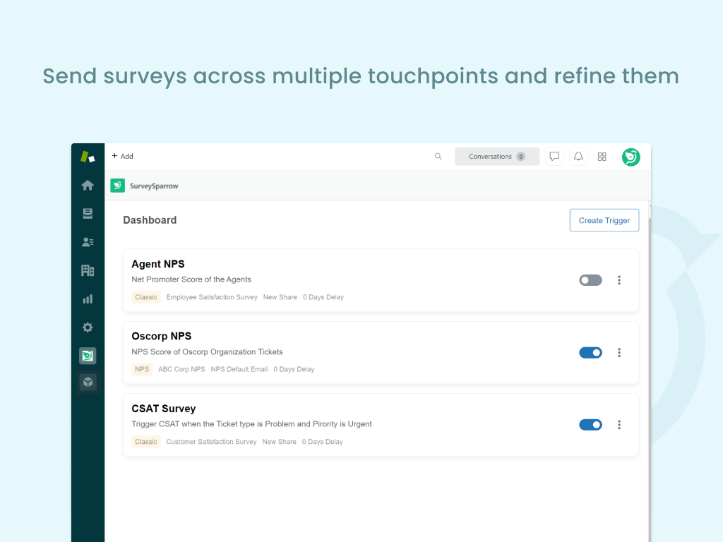 SurveySparrow is an omnichannel experience management platform that lets you create conversational surveys. From creating surveys to collecting insights and later acting upon them, the platform lets you refine experiences the easier way. We have so far revolutionized the conversational experiences for over 1,00,000+ businesses across 149 countries.
