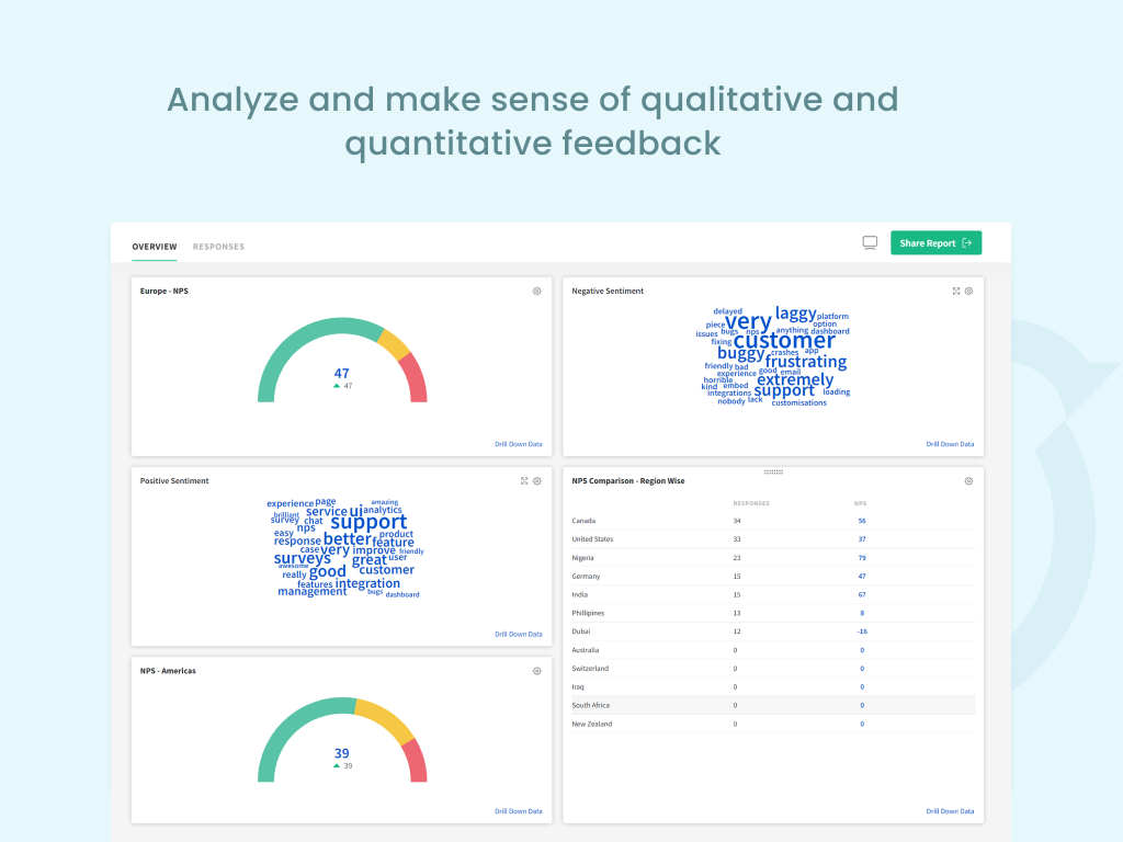 Our conversational and intuitive UI makes it easy for the users to explore the platform and create highly personalized experiences that can increase the survey completion rates by a whopping 40%.SurveySparrow lets you collect meaningful insights that matter for your business. With robust reporting modules, you can analyze & visualize the survey data in the way you love.
