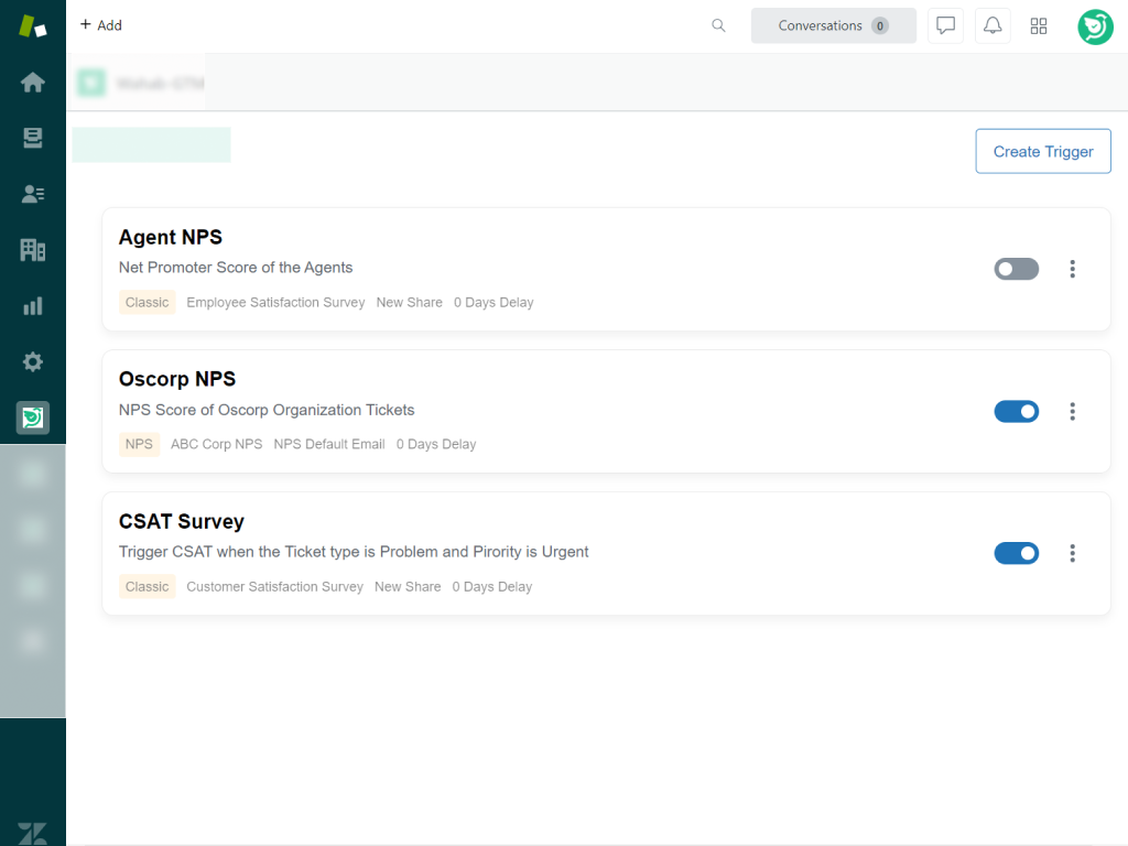 Configure the trigger details. Name the trigger and give a description for future references. Now, choose the survey type, the survey, and email share, from the dropdown. Optionally you can set a delay if your survey should trigger after x days.