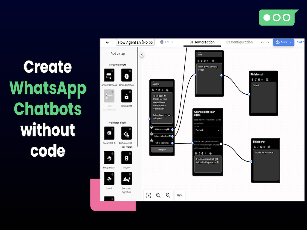 Set up your own WhatApp flows according to your business needs. Use our no-code tools to design and launch your WhatsApp Chatbot and connect it to Zendesk in minutes. Let your team focus on your core and leverage our technology to automate your processes via WhatsApp.