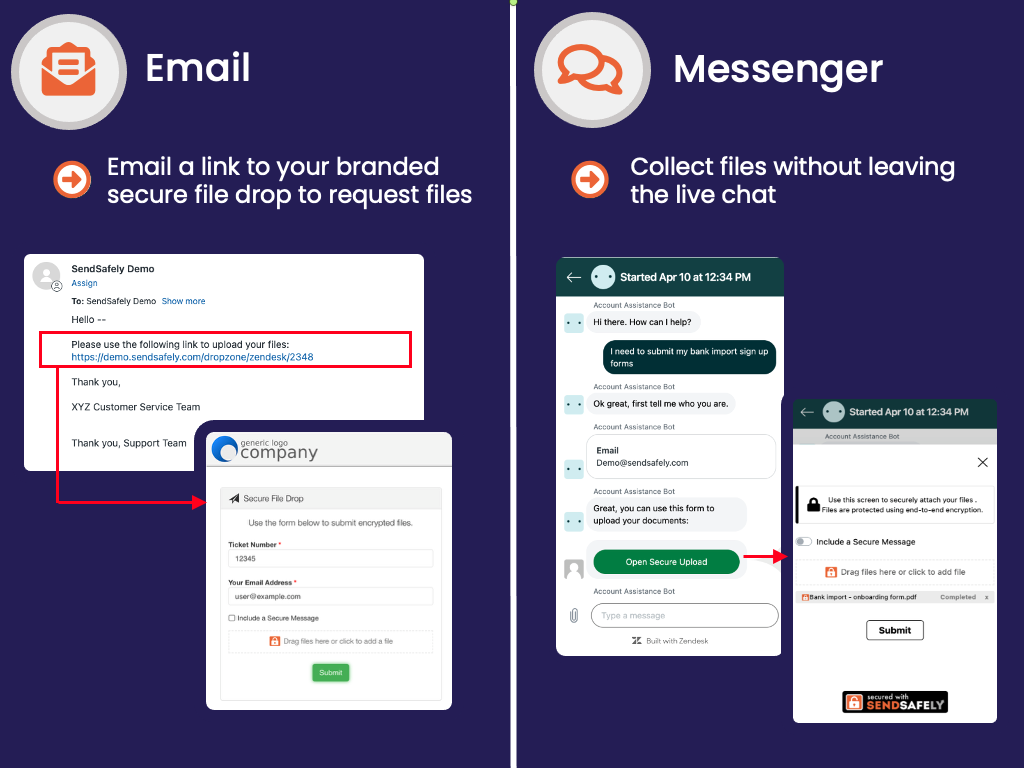 SendSafely allows your support team, and AI agents to securely send, receive, and store sensitive files and messages within Zendesk using end-to-end encryption, ensuring compliance and enhancing customer trust. Manage encrypted attachments effortlessly with seamless integration across both the Agent Workspace and Zendesk Messenger, including automated secure data collection initiated by AI agents.