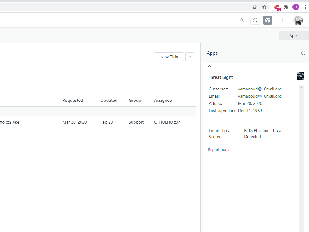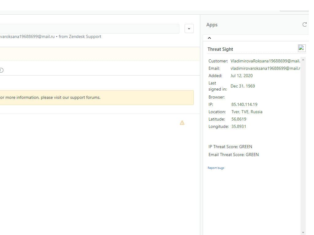 The Threat Sight application integrates open source threat intelligence into your Zendesk tickets view. It pulls down threat indicators from a number of open source threat intelligence sources, and matches based on email address and IP address. If a threat is found, it tells you which threat list is triggered, and why the threat was detected.