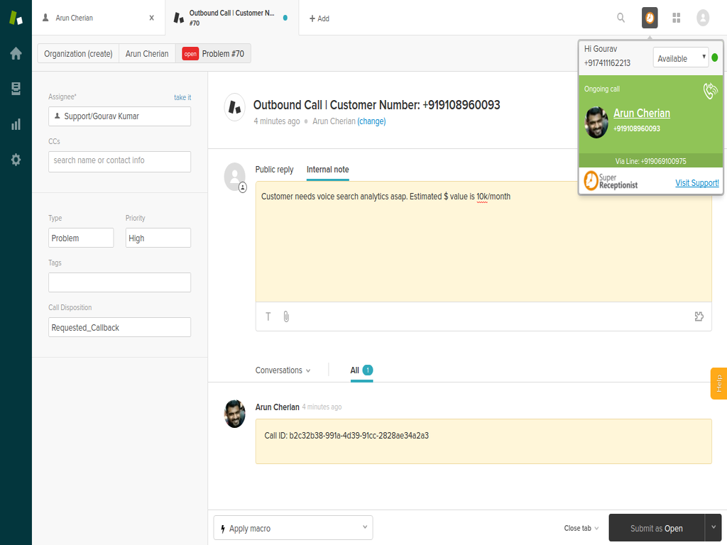 With this amazing new integration, customers can get a special phone number from SuperReceptionist integrated with their Zendesk account. When customers call in, support teams can welcome them with a customized message, inviting them to submit a support ticket. If customers call in during business hours, they can even be directed to a live support agent automatically. Agents can greet customer with his name and also be aware of previous conversations and choose to link the calls to previous tickets or create new ones. Once the call is completed, SuperReceptionist automatically creates a support ticket on behalf of the customer, with a link to the call records. What's more, agents can even make calls right from the Zendesk account!!