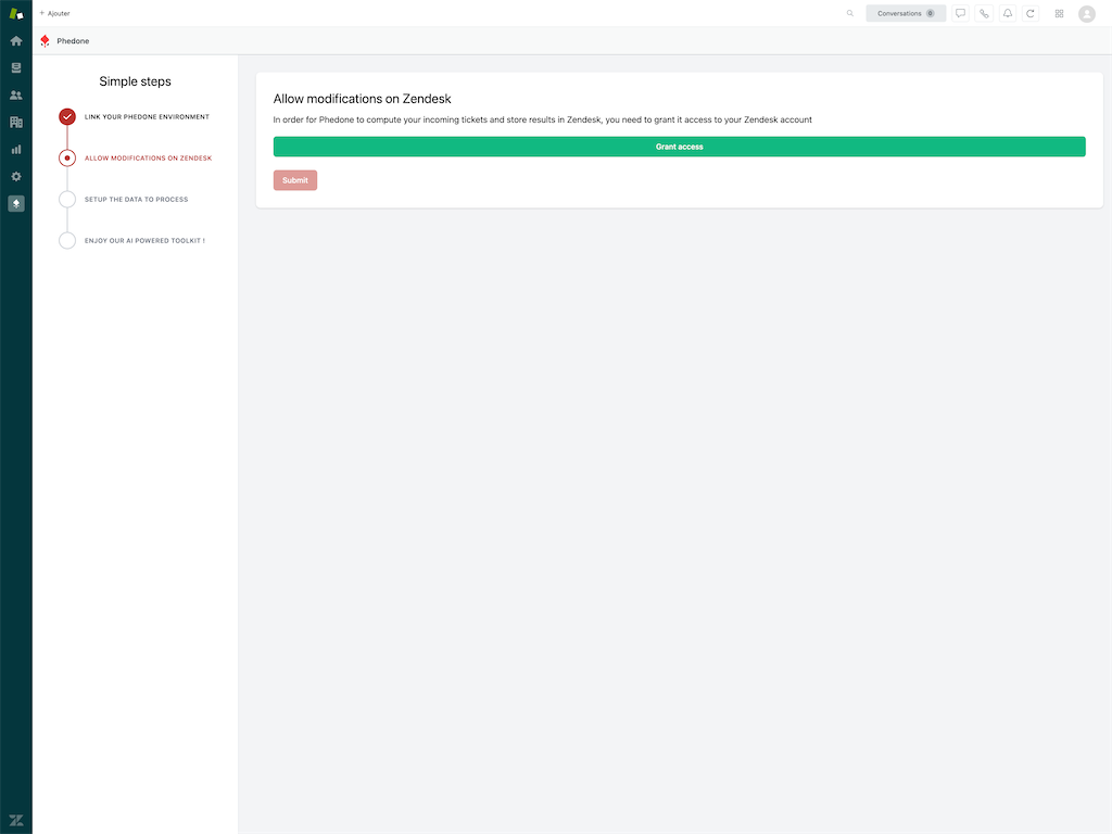 To add informations to you incoming tickets, Phedone requires permission to read and write tickets informations to Zendesk, you will need to allow it by OAuth authentication.