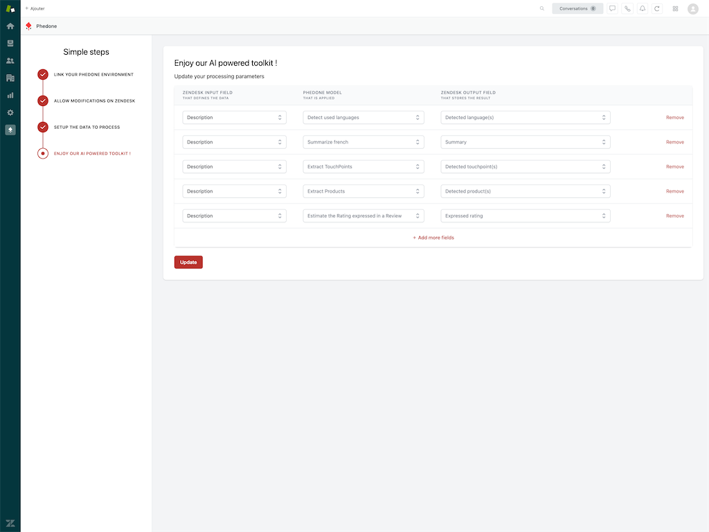 Phedone leverage NLP Machine Learning models on demand and will fill your incoming ticket fields based on the results of the picked continuous analysis models such as products and touchpoints detection, priority, express review rating, summary, language detection and much more.