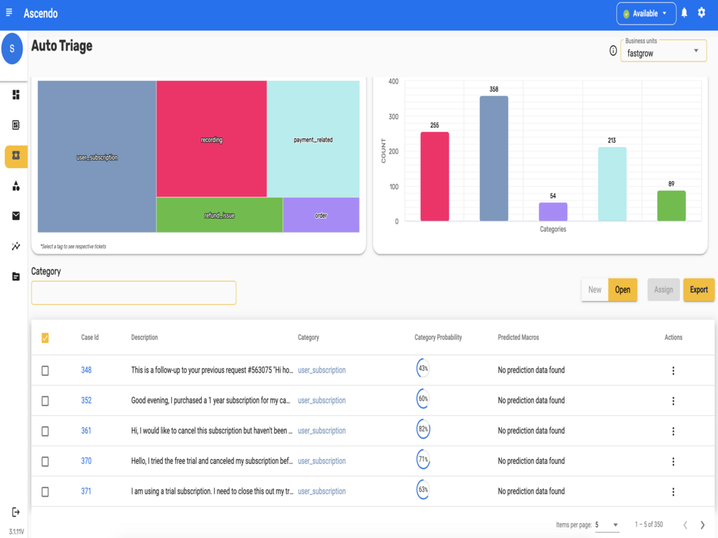 A: Ascendo has the ability to identify new clusters of problems. It also give an agent the ability to provide answers to unresolved questions, and learns them as well to be prediction ready.