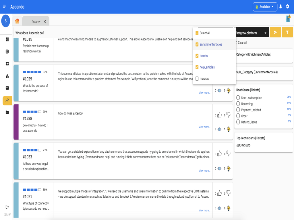 A: As a part of Ascendo Reveal, Ascendo lets users dive deeper into customer queries. Ascendo provides you insights for Top Questions, Top Products, Tribal Knowledge, Leaderboards, Usage Metrics and much more.