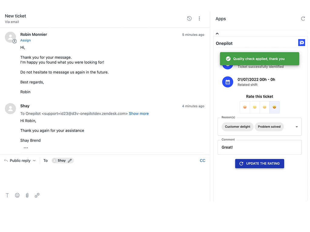 Quality check management: follow and apply quality check on tickets done by Onepilot