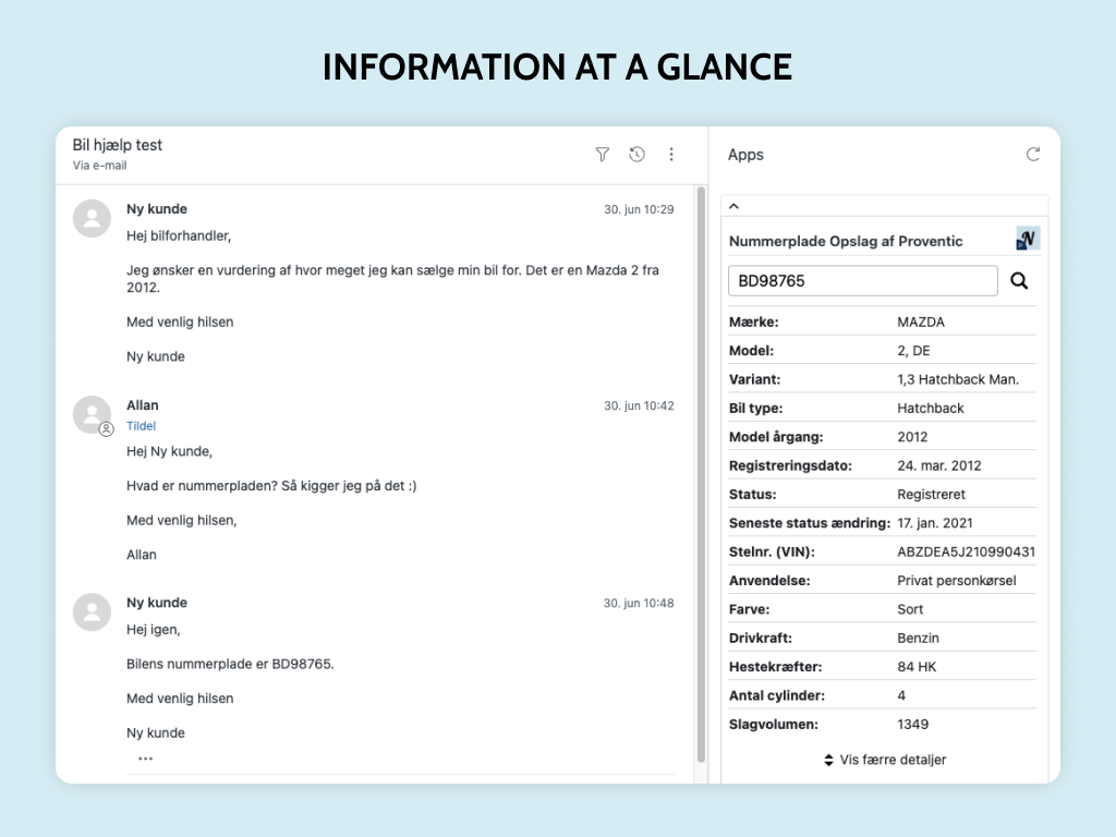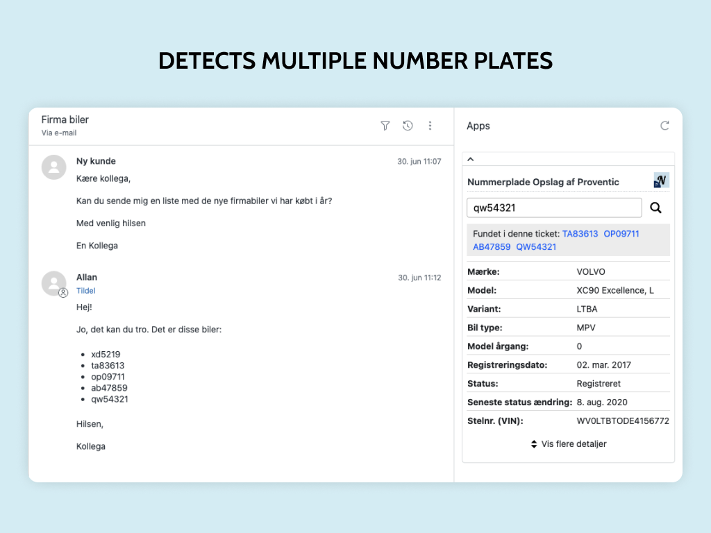 DK number plate lookup by Proventic can automatically look up a Danish number plate / license plate, written in the ticket conversation and subject, and display the car information in the ticket sidebar.