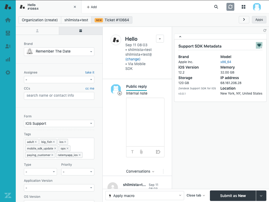 Support SDK Metadata App allows you to see information relating to a ticket and device if it was created via the Support SDK. The following information is displayed about the end-user and their device in the ticker sidebar: