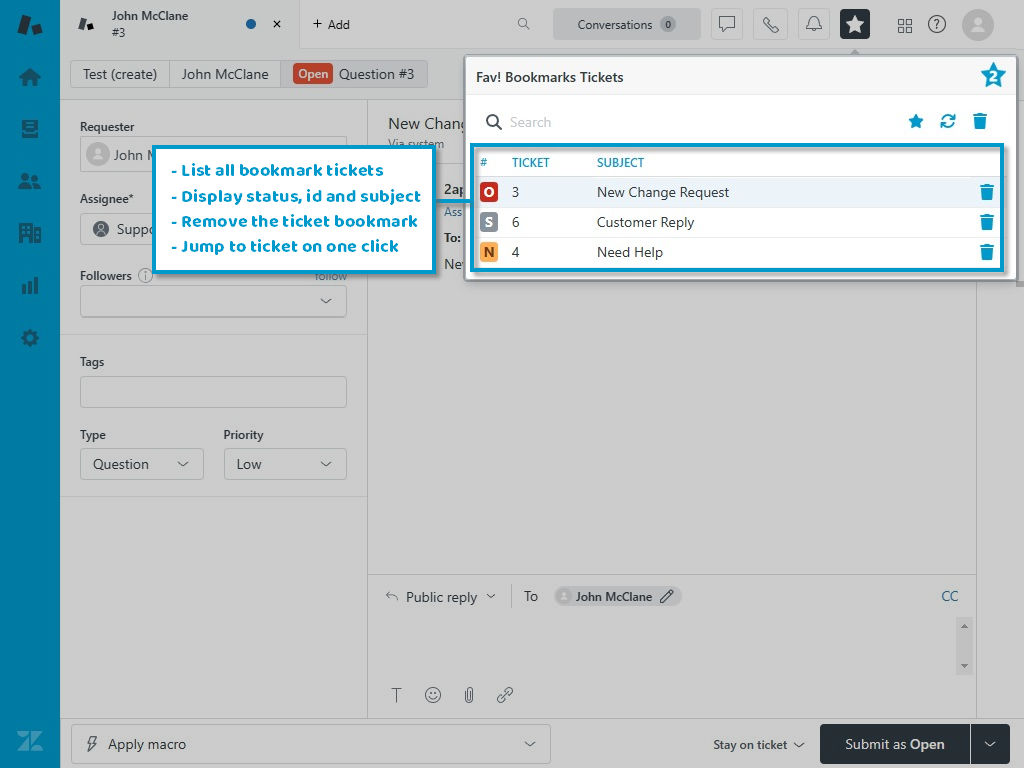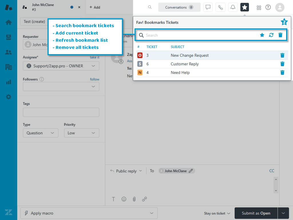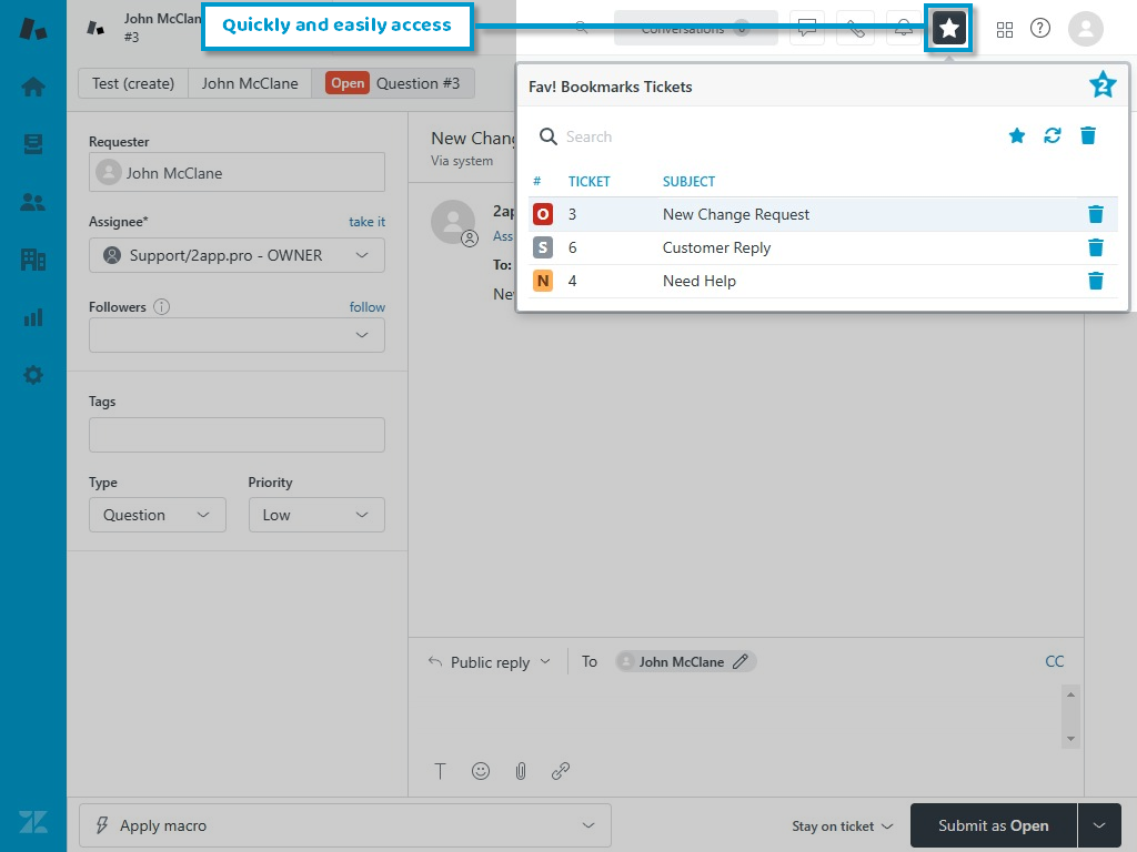 Fav! Bookmarks Tickets is an efficient bookmarking application that can greatly improve the productivity of your support team. By bookmarking important support tickets, your agents can quickly access information from Zendesk, leading to faster response times for customers and improved customer satisfaction.
