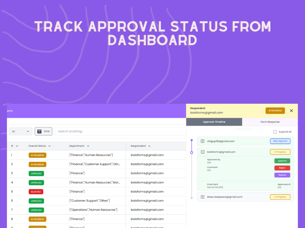 1) Have a single approval workflow. Here, a manager can create a simple Google™ form for an approval process that they want. Now, they have to open Boloforms and turn the Google™ form into an approval workflow and share the link of Boloforms Approvals to their applicants. The applicants can fill the form, the manager gets a request via email for every approval that comes through, they approve or reject the application and the recipients are further notified of the status of their application via an email. A detailed view of all the statuses of applications and their links are show in the Google™ sheet attached to their form.