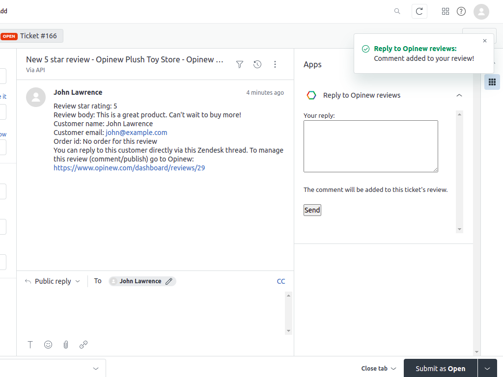 Click on install to connect Opinew with Zendesk, and whenever a ticket is created by Opinew, this app will let you reply to that review directly from Zendesk.