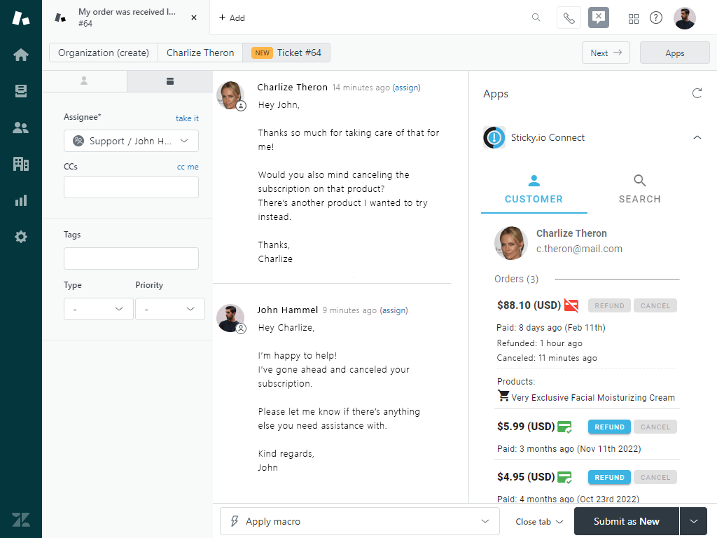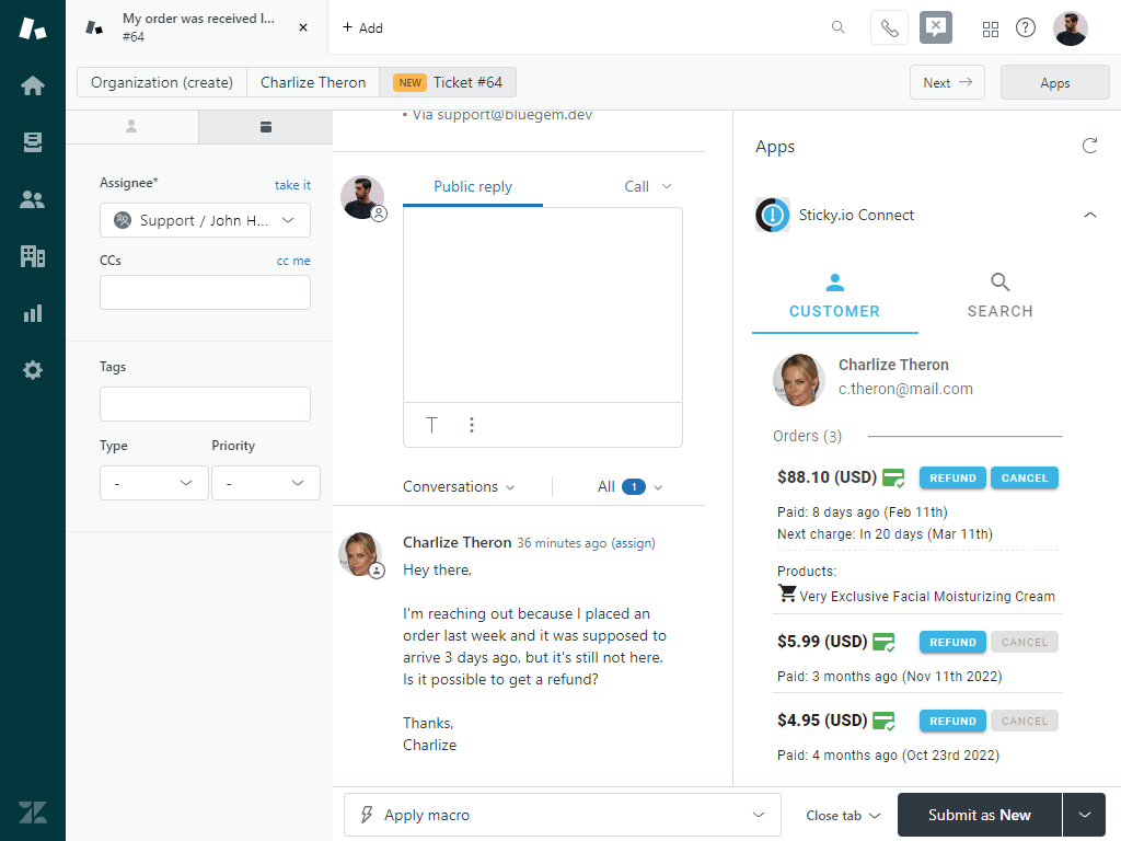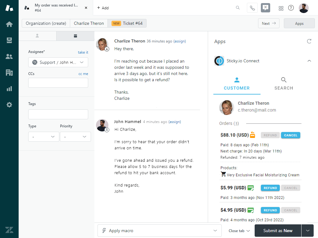 Manage all your customer payments and subscriptions seamlessly within Zendesk Support using Sticky.io Connect. You can easily view customers and orders, process refunds, and cancel subscriptions. Our efficient algorithm guarantees that payment data is instantly linked to the relevant support tickets, enabling you to resolve issues promptly and efficiently. Say goodbye to time-consuming payment management and hello to streamlined support ticket resolution.