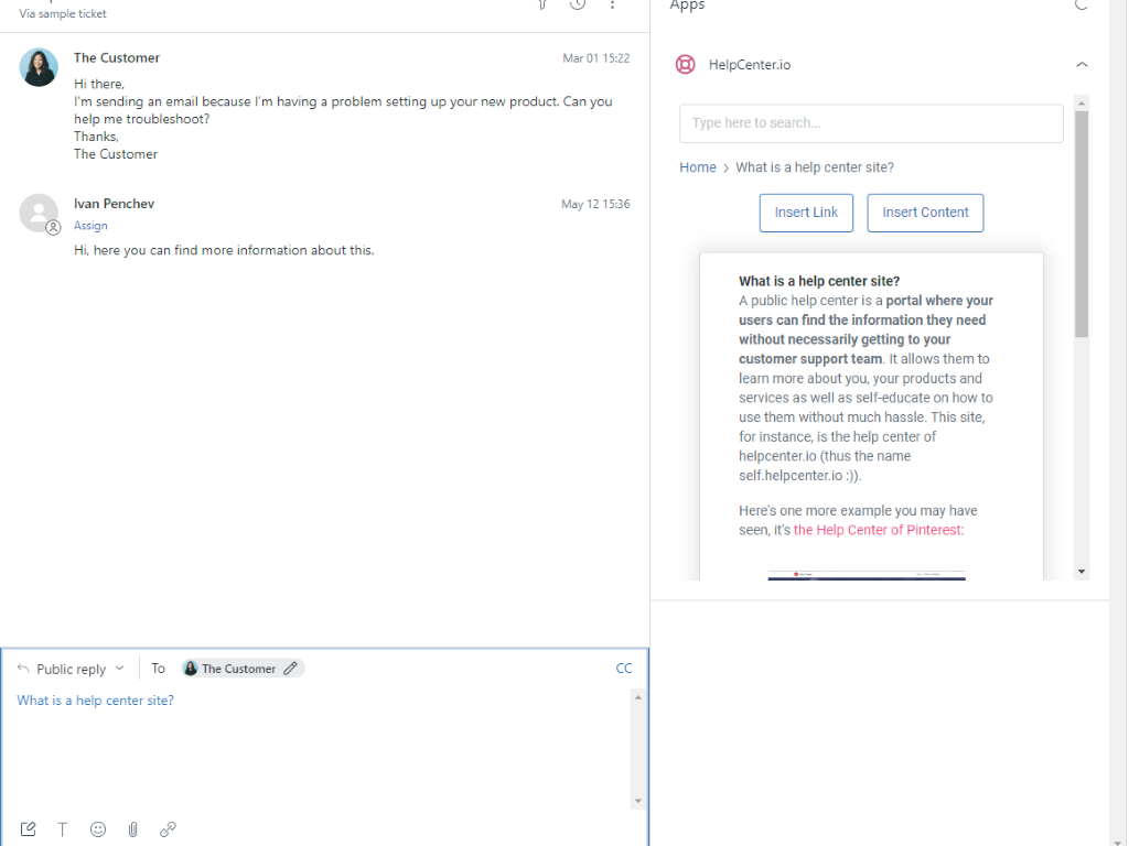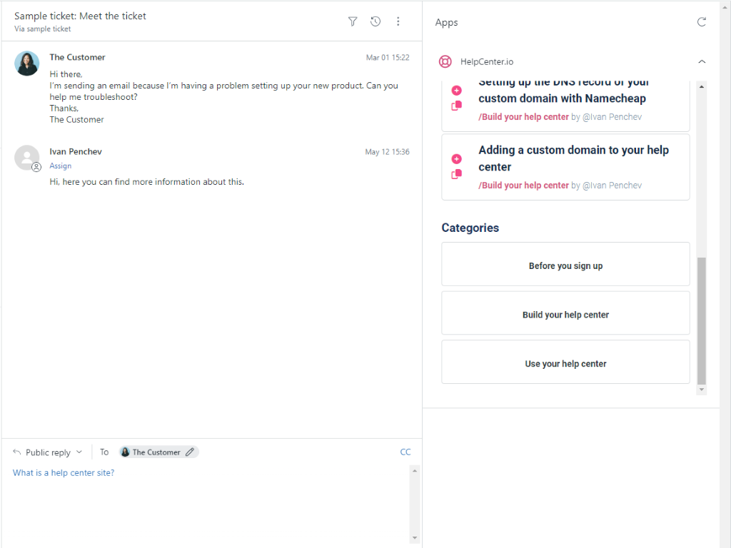 You will now see the HelpCenter.io app in the sidebar of your Zendesk ticket view. You can use it to search for articles in your help center and insert them into your ticket replies.