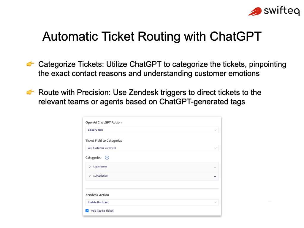 Bring the power of AI into your Zendesk support! Check out Swifteq’s Triggers+ChatGPT app — a ChatGPT integration with Zendesk triggers that helps your team by handling repetitive tasks automatically.