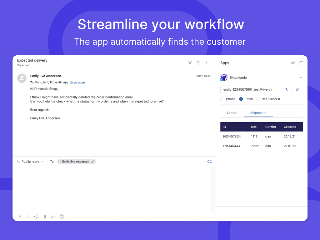 Empower your support agents with the Shipmondo app, offering them a concise and speedy snapshot of both historical and ongoing customer orders and shipments. This includes order status, comprehensive order line information, track and trace no., and a direct link to delve deeper into the details via your Shipmondo dashboard.