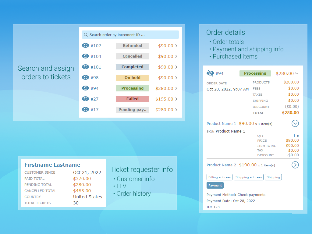 1.Providing information about the customer and orders directly in the ticket page