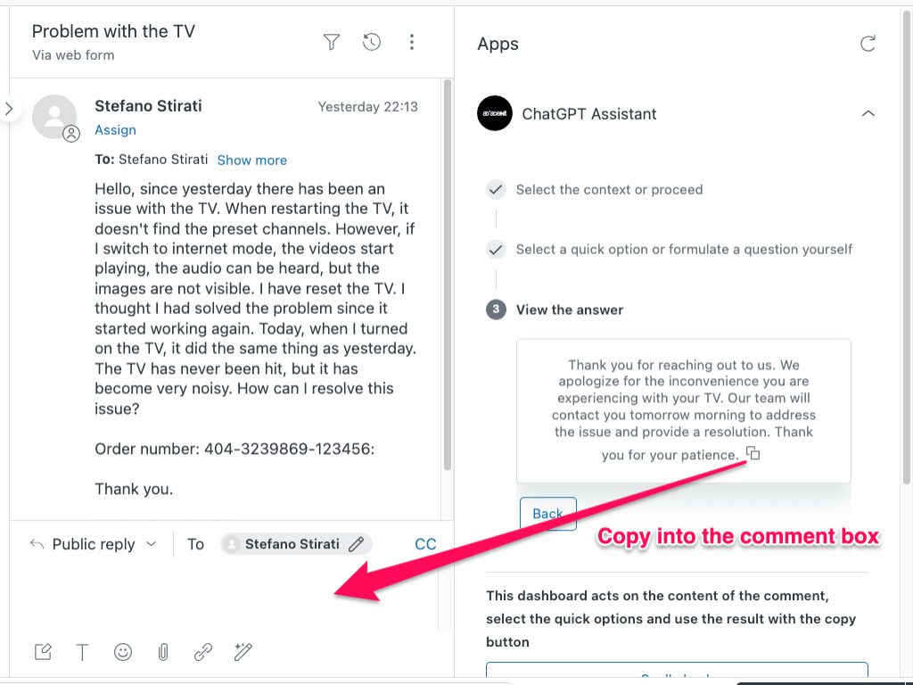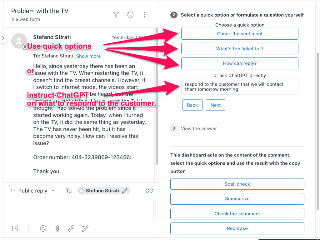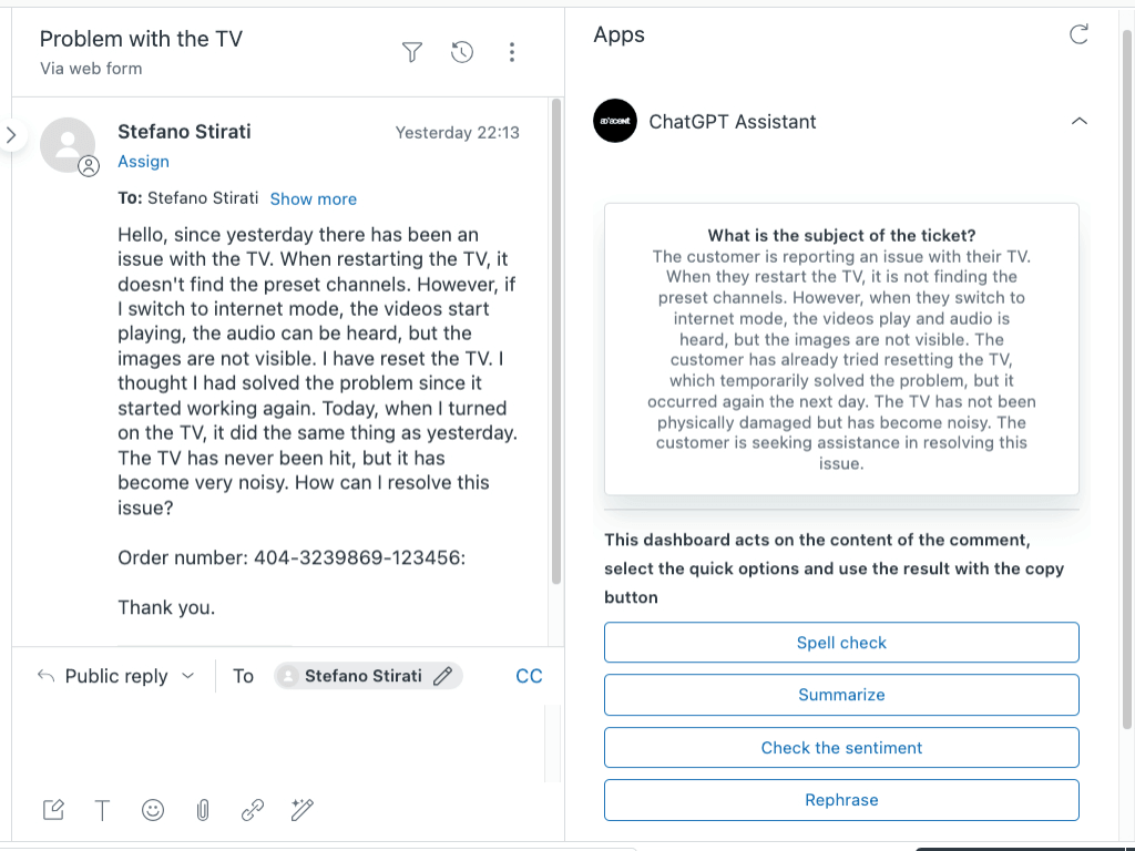 1️⃣ Summarize the ticket: Agents can extract a concise summary of the selected ticket's content. 2️⃣ Suggest a ready-made response to the agent for the customer: Based on the ticket's context, ChatGPT can suggest predefined and suitable responses for the customer.