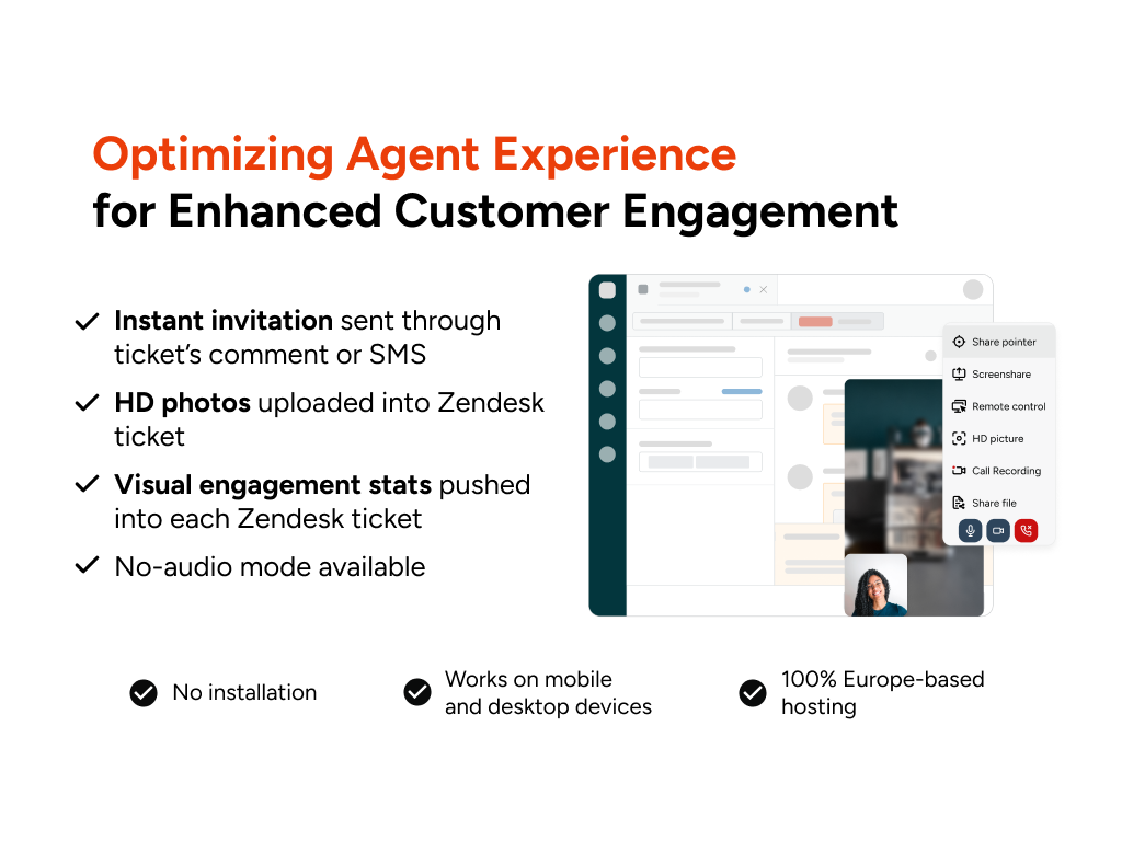 - User-friendly: No app installation is required. Fully compatible with Zendesk (for agents) and any web browser (for customers).
