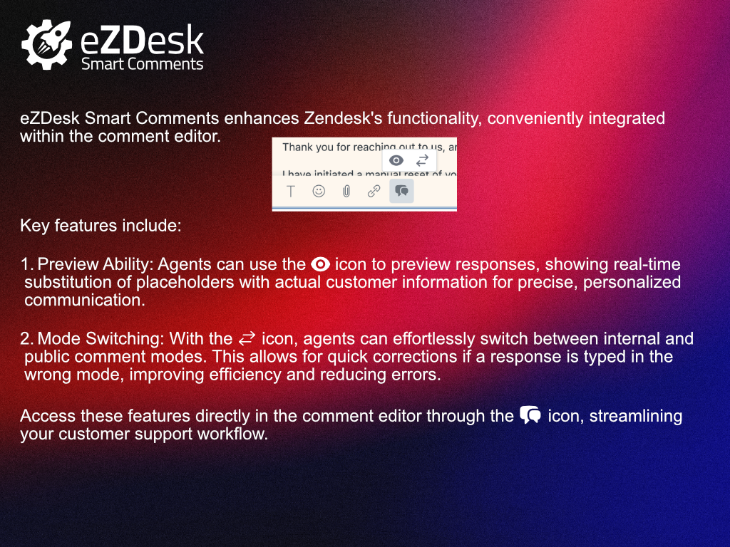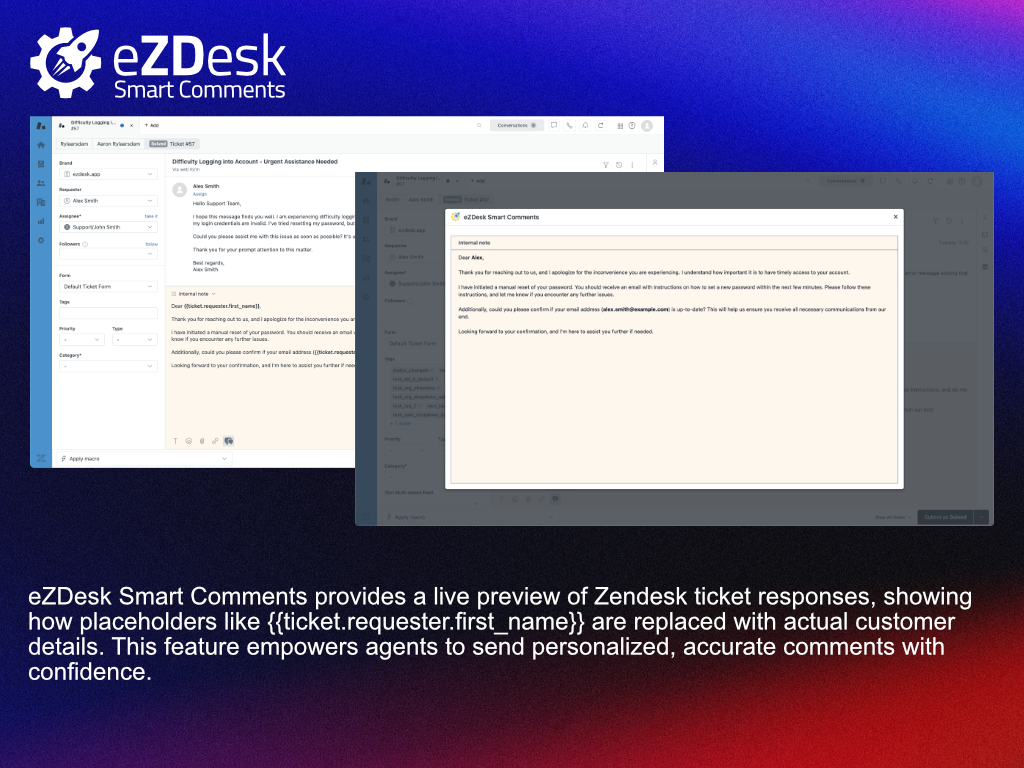 Zendesk placeholders can be unpredictable, leaving agents unsure about what customers will actually see. eZDesk - Smart Comments eliminates the guesswork by letting agents preview placeholders inside their comments before sending a reply.