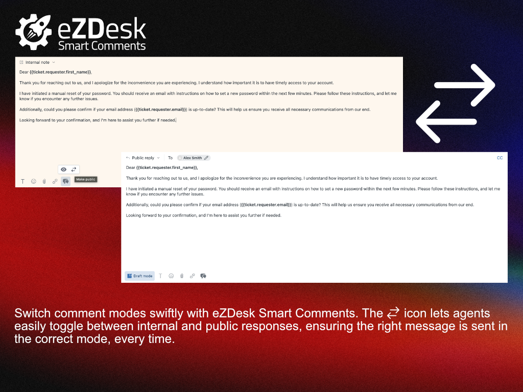 - Seamless Comment Mode Switching – Easily toggle between internal and public comments, ensuring messages are sent in the correct context.