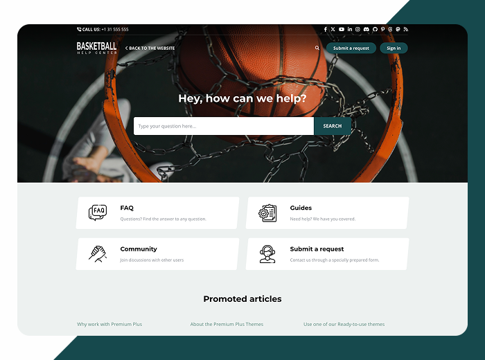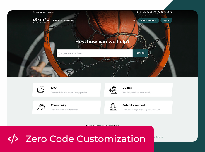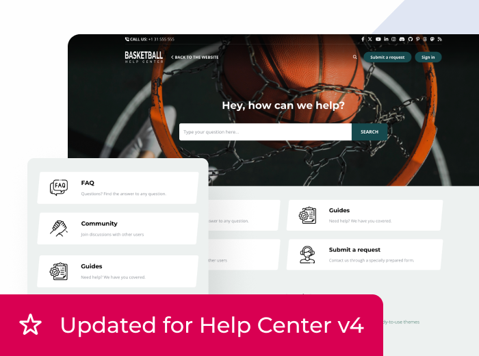 Dribble is the ultimate basketball-inspired Zendesk help center theme, crafted for those who play to win. Built to support Help Center v4 and Generative Search, it offers expansive customization options, allowing you to tailor every color and detail to reflect your club’s unique identity.