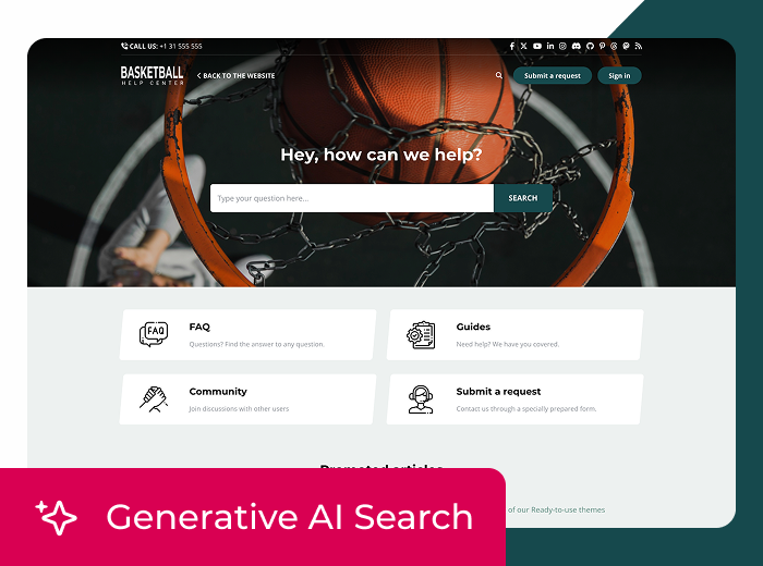 Dribble is a basketball-inspired Zendesk help center theme, fully compatible with Help Center v4 and Generative Search. Customize every detail to match your club and create a vibrant self-service hub for your fans.