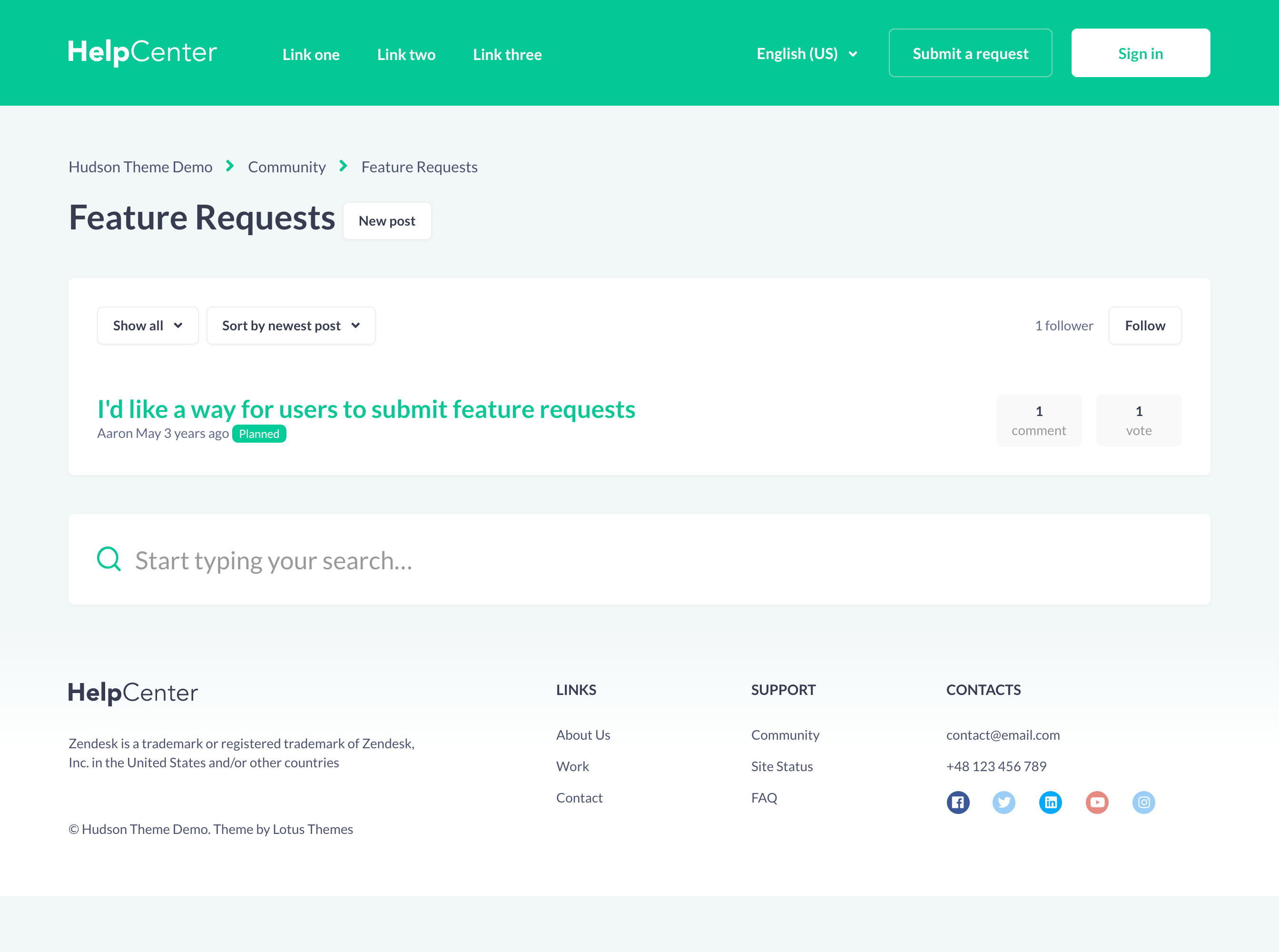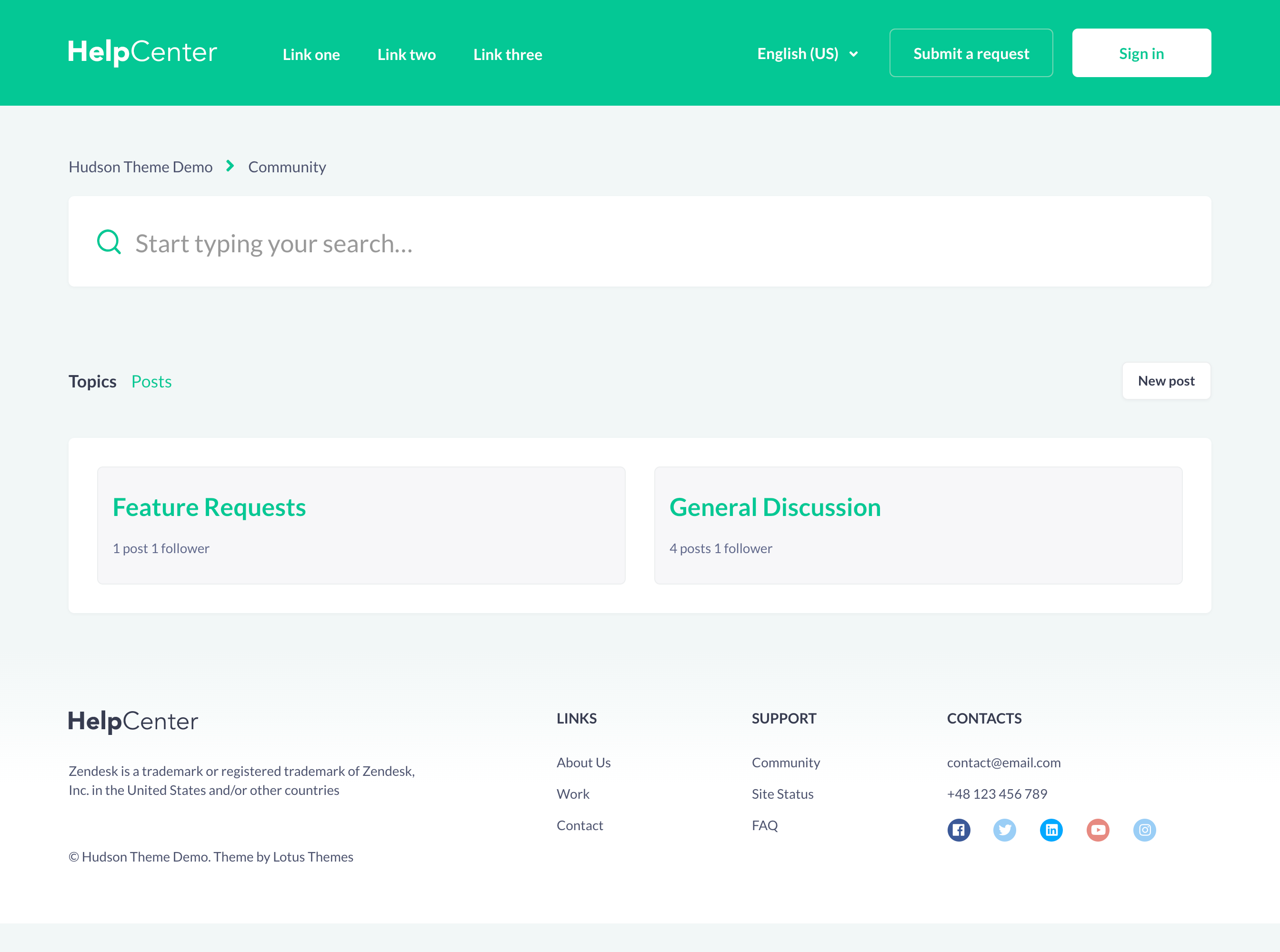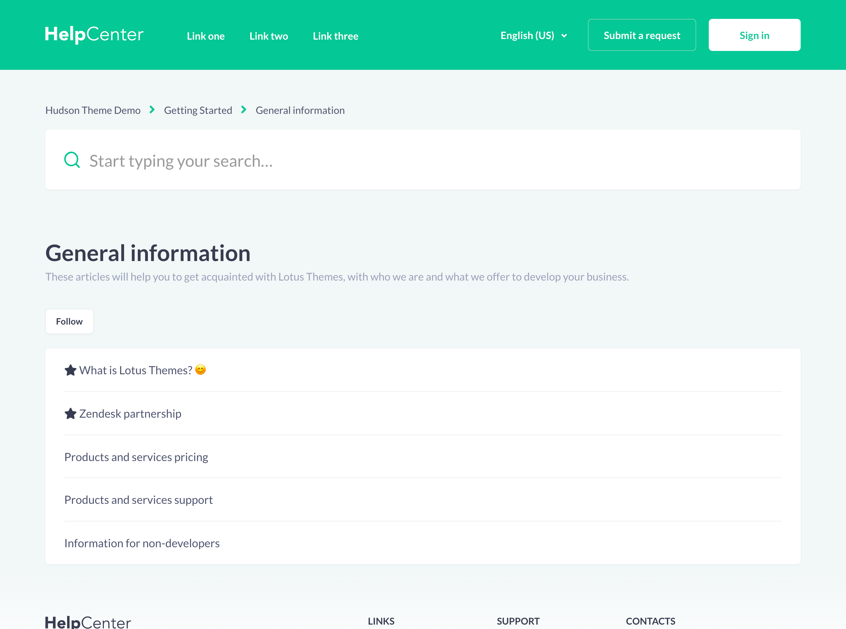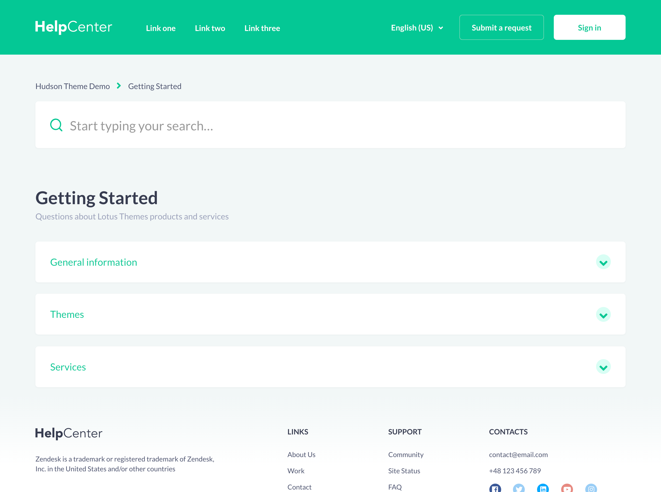 Hudson is a Zendesk theme that is perfect for a FAQ-Style Help Center because it features accordions in sections. This template is fresh, playful, and it is really fun to use.