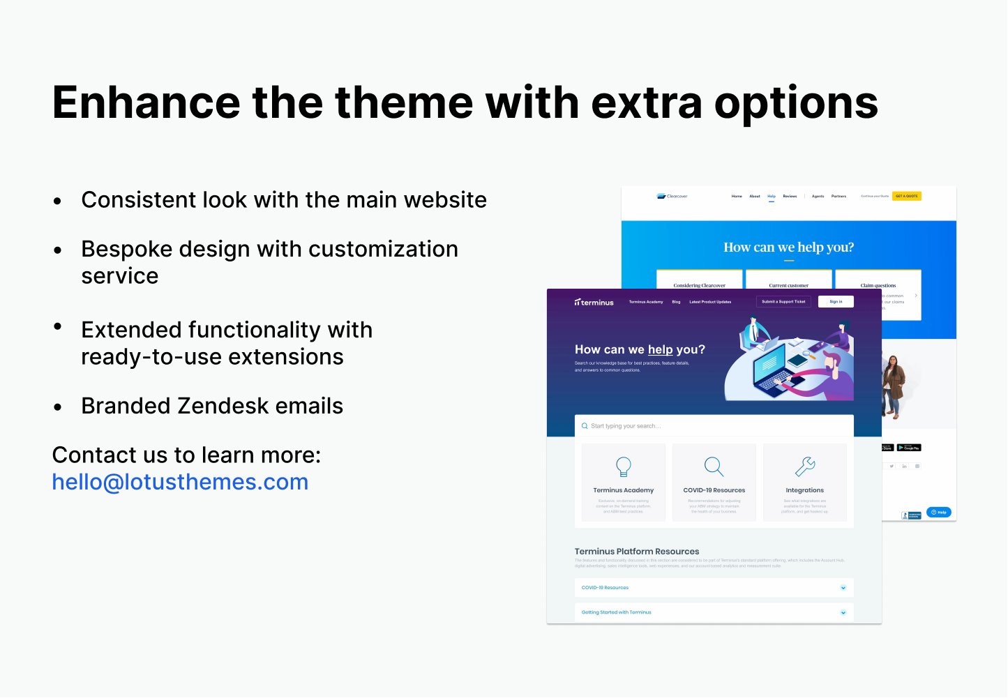 5,000+ companies have chosen Lotus Themes for their beautiful design, consistent performance, and ease of use. Even Zendesk hires us to improve their help centers. View case studies →