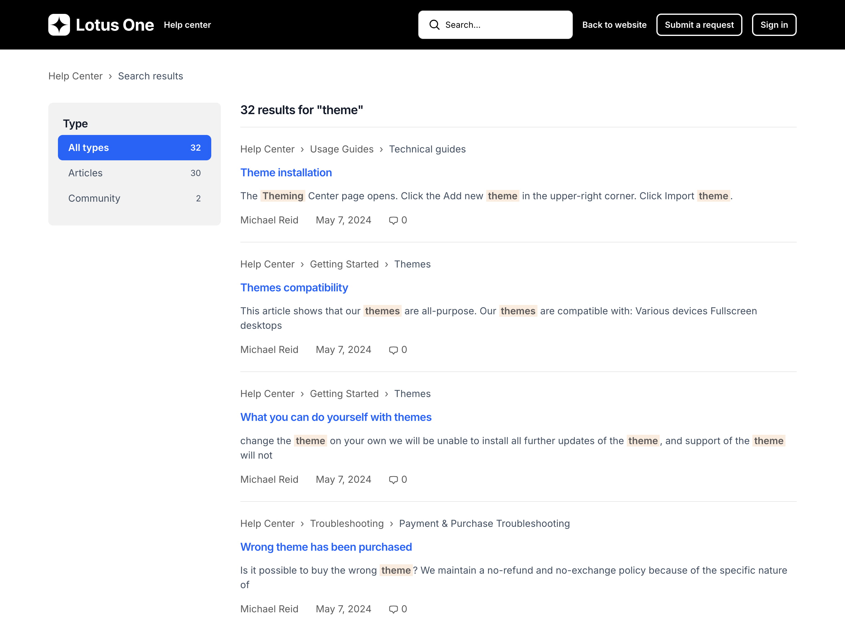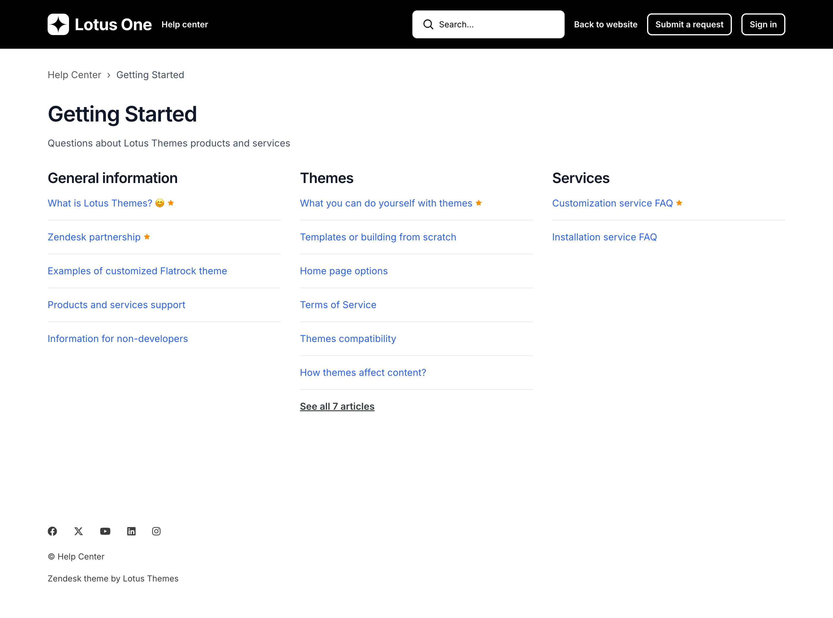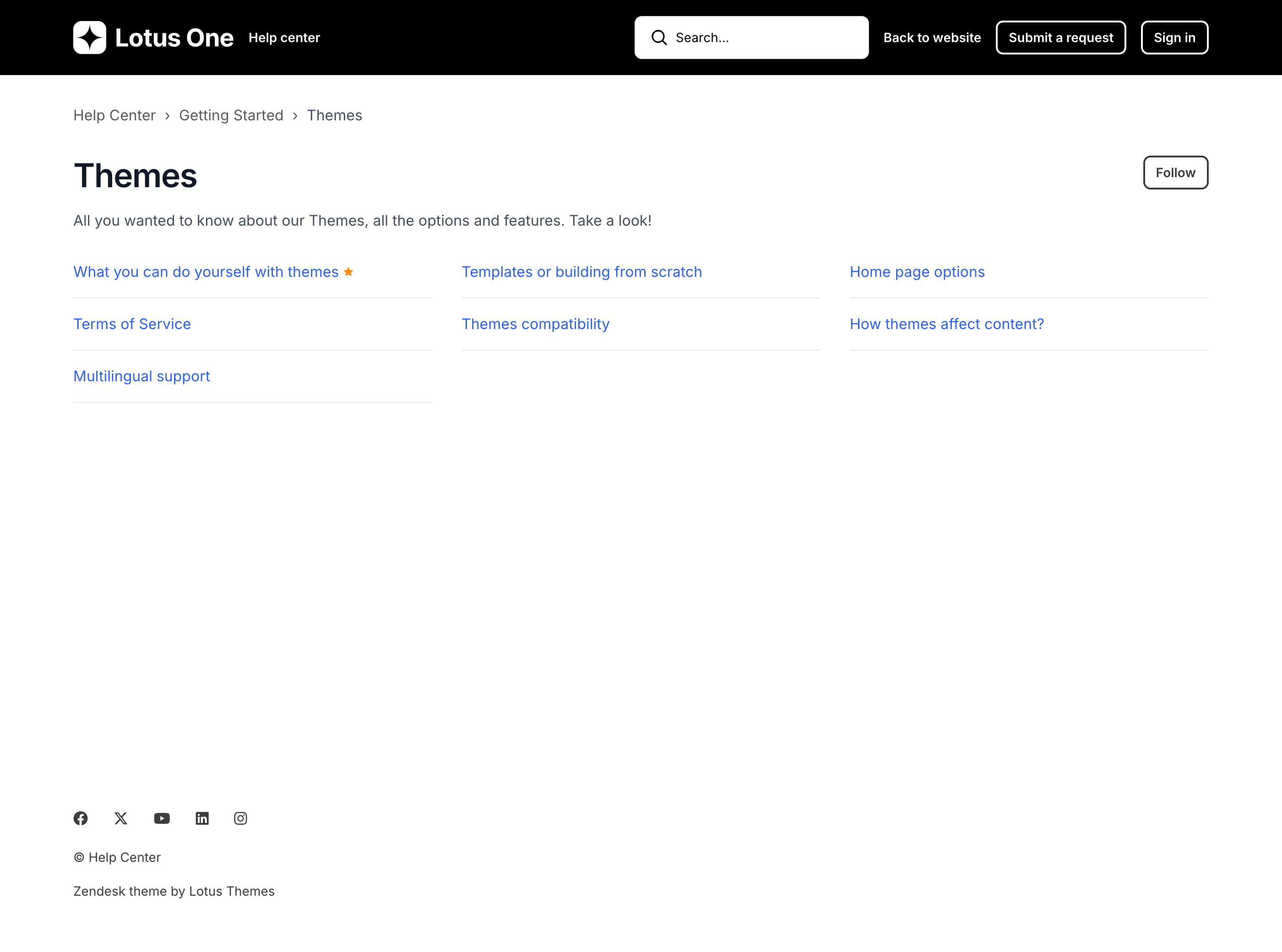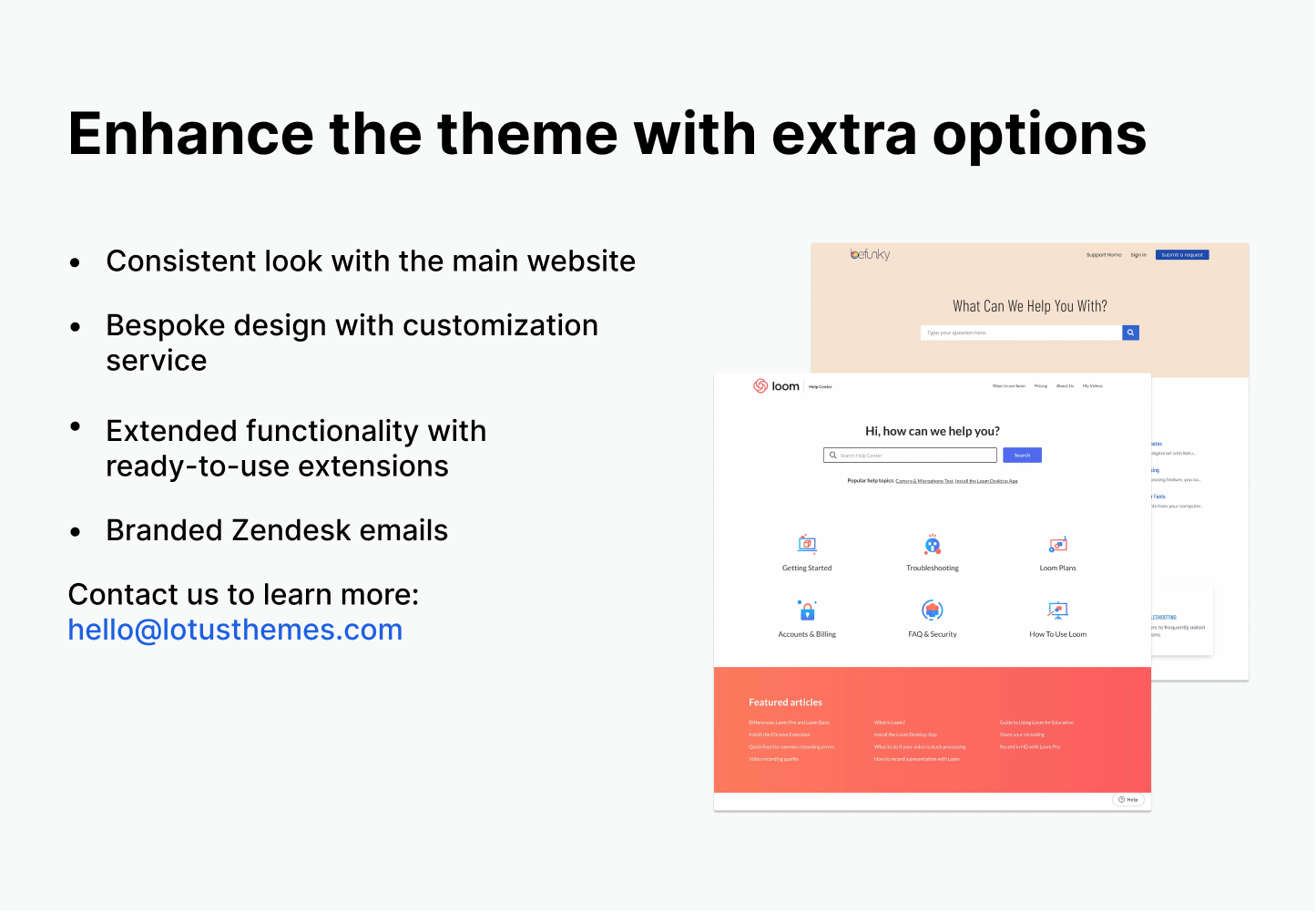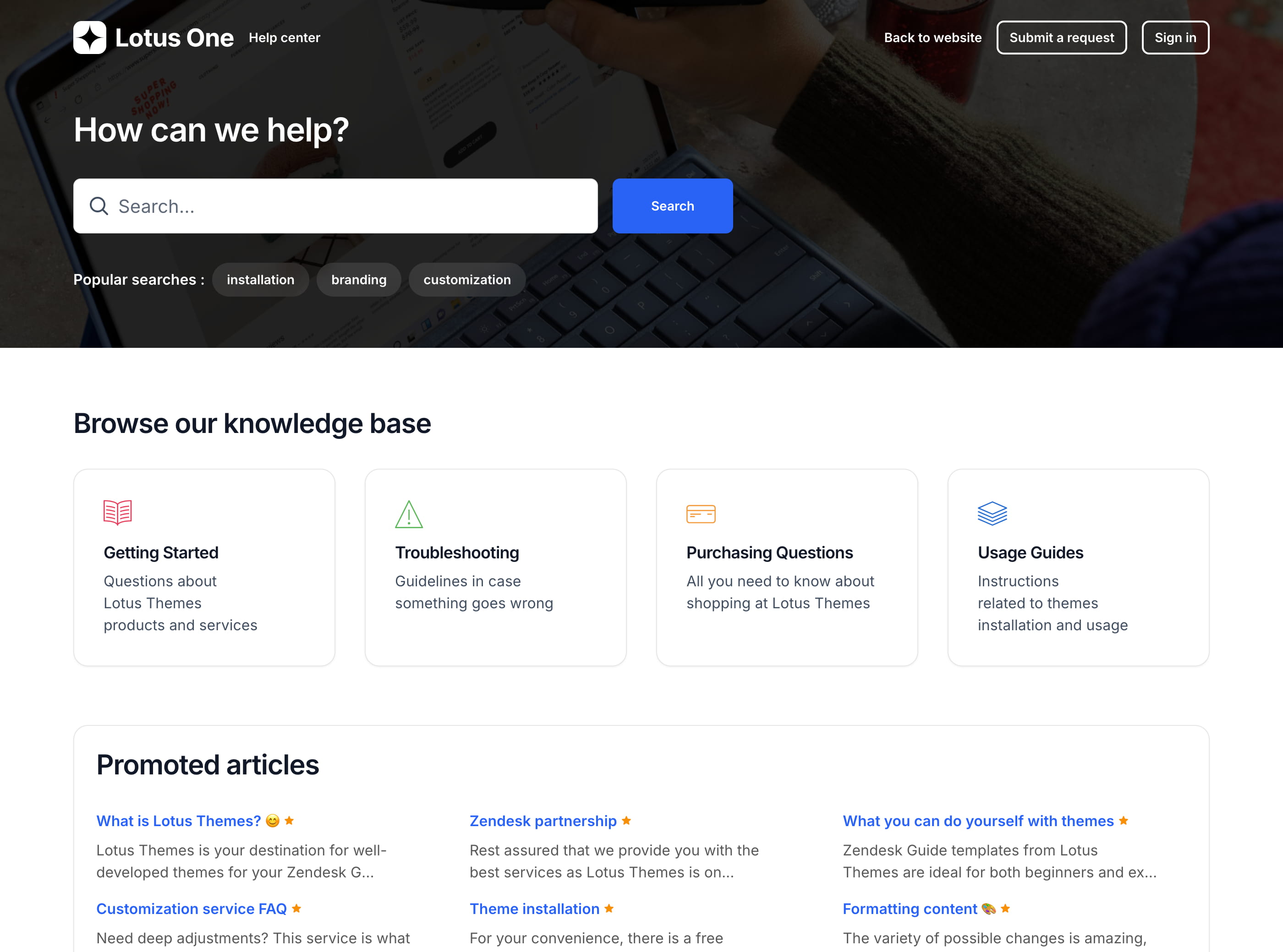 5,000+ companies have chosen Lotus Themes for their beautiful design, consistent performance, and ease of use. Even Zendesk hires us to improve their help centers. View case studies →
