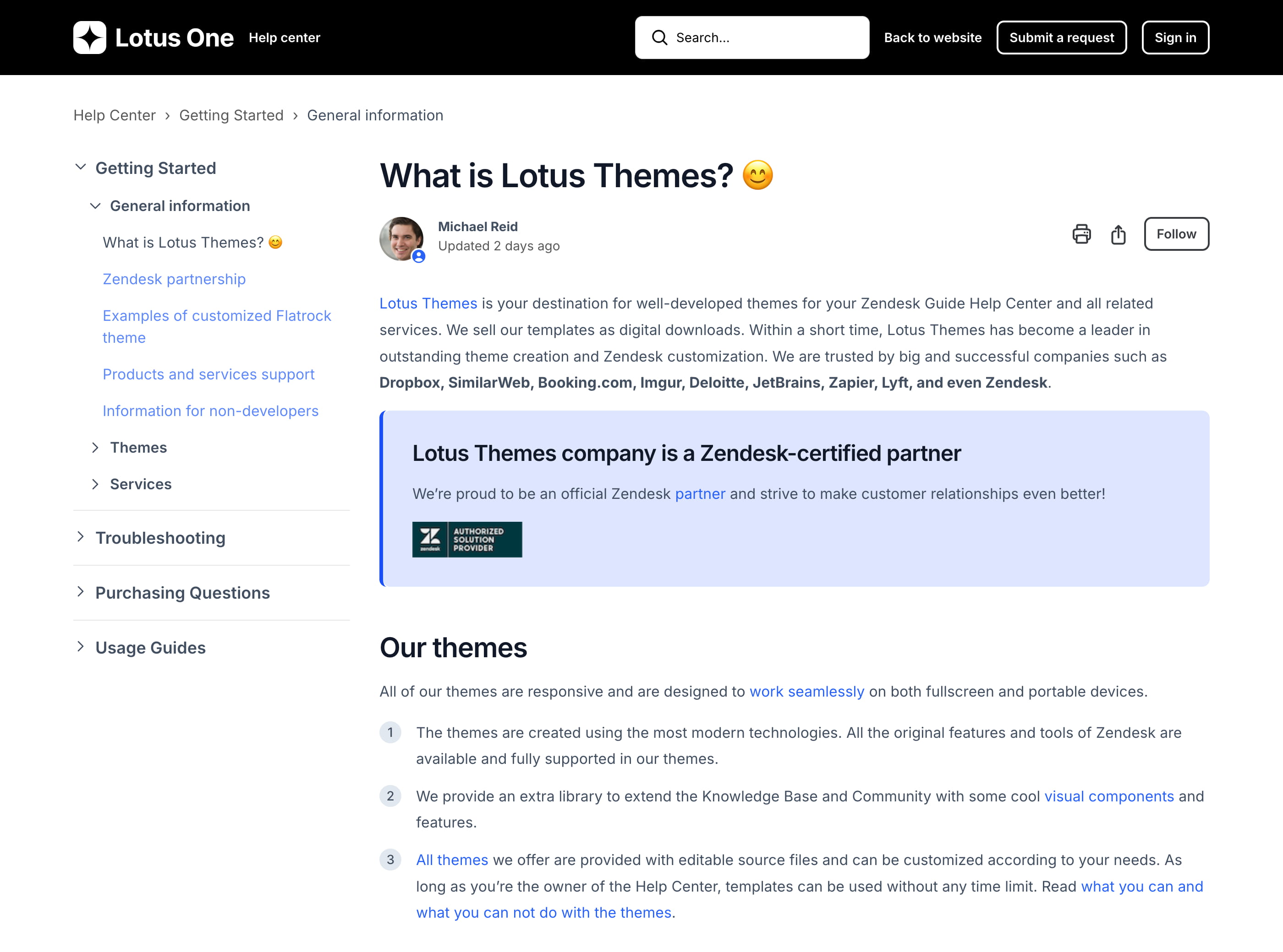 Lotus One is a custom Zendesk theme that includes additional features like side navigation, prev/next buttons, and categories with icons on the homepage. Get a customized template and save about $400.