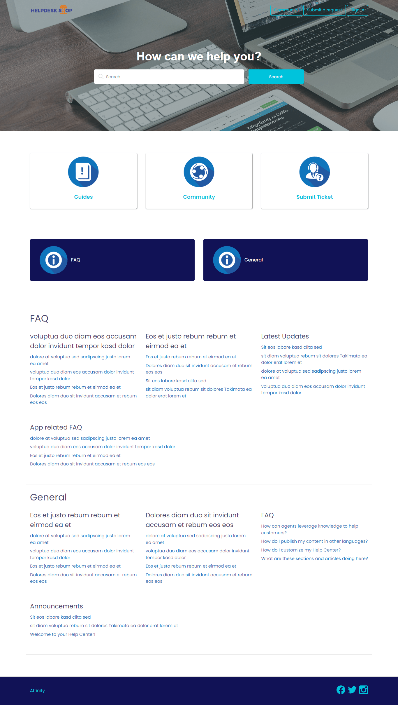 Affinity is a fully responsive multipurpose Zendesk Help Center (Guide) theme. The theme is a perfect balance between style and performance. All the elements of the help center are arranged in a way that keeps navigation super easy. The theme has an attractive image on the background and a floating search box at the center of it which gives the theme a classic touch. It has a stunning full-screen layout with beautiful blocks and interactive design elements.