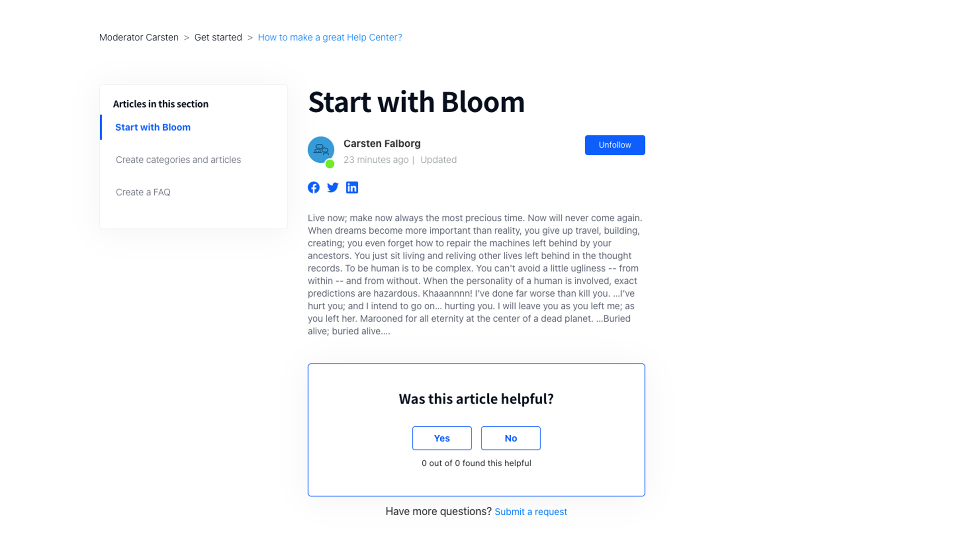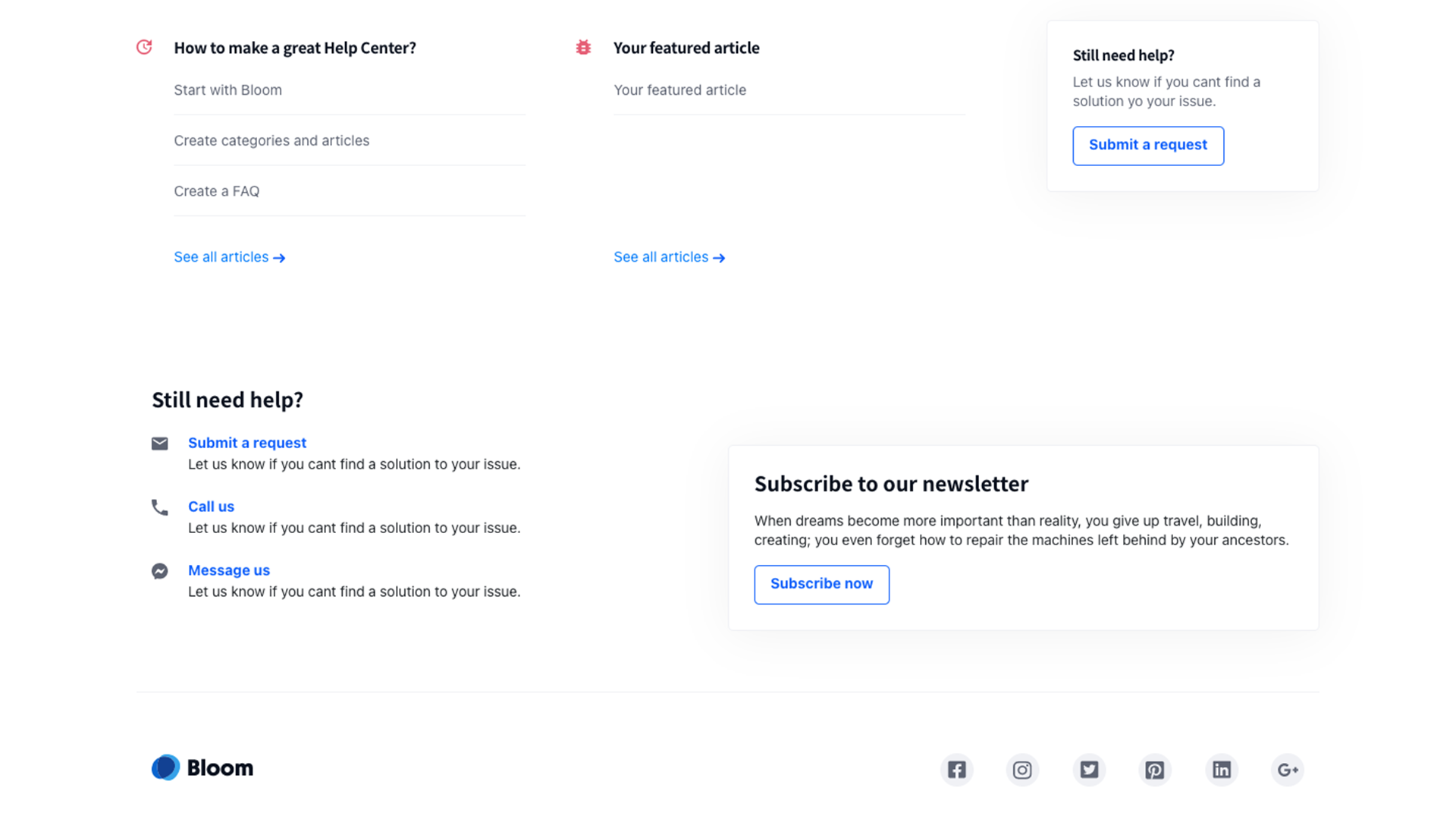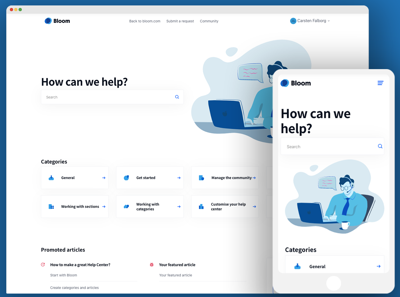 Bloom makes it achievable to everyone to create awesome help centers. To customize the theme you don’t need to be an educated developer or have years of experience. Premade UX and UI features make it simple to adjust all settings, those can be changed through an easy to use dashboard. However, if you have passion for development our code is clean and easy to modify and maintain, and opens the door for even more customization!
