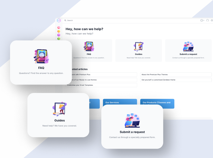 Extended functionalities of our Zendesk theme make help center content more accessible, with features like popular searches, promoted articles, recent activities, ‘articles in this section’, etc.