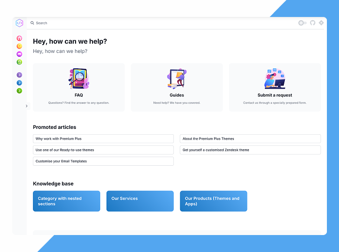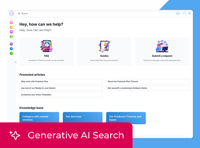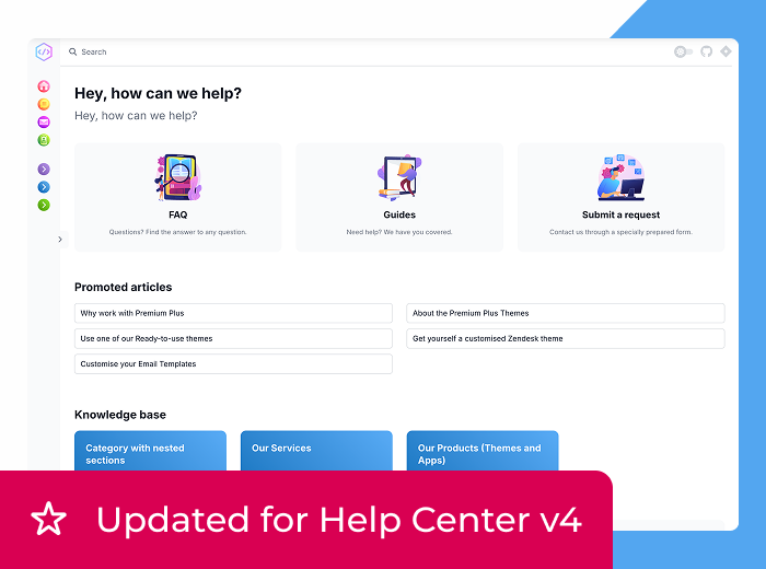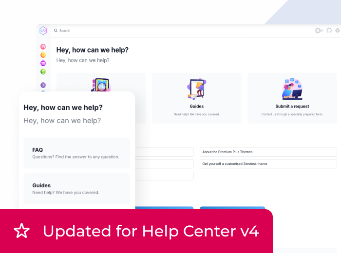 A colorful, flexible Zendesk theme built for growth. Perfect for apps and SaaS platforms needing organized, easy-to-read documentation. Enjoy extras like dark mode, code previews, and GitHub integration. Optimized for Help Centre v4, with support for Generative Search and Employee Service Suite.