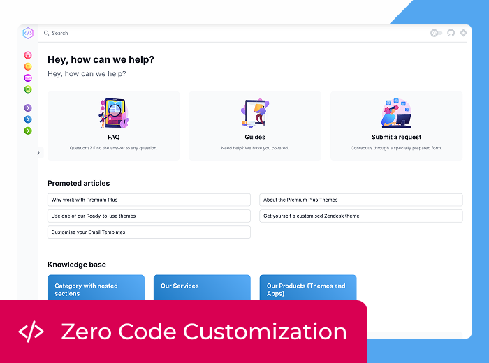 Unlike most Zendesk themes, Code Monkey unlocks endless possibilities for in-house help centre customization. No coding skills or extra costs required.