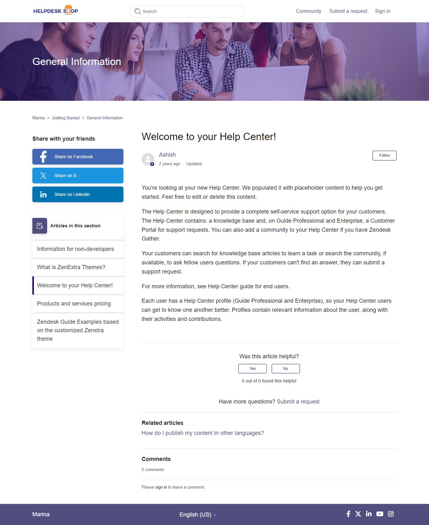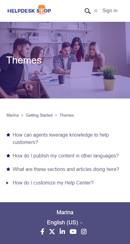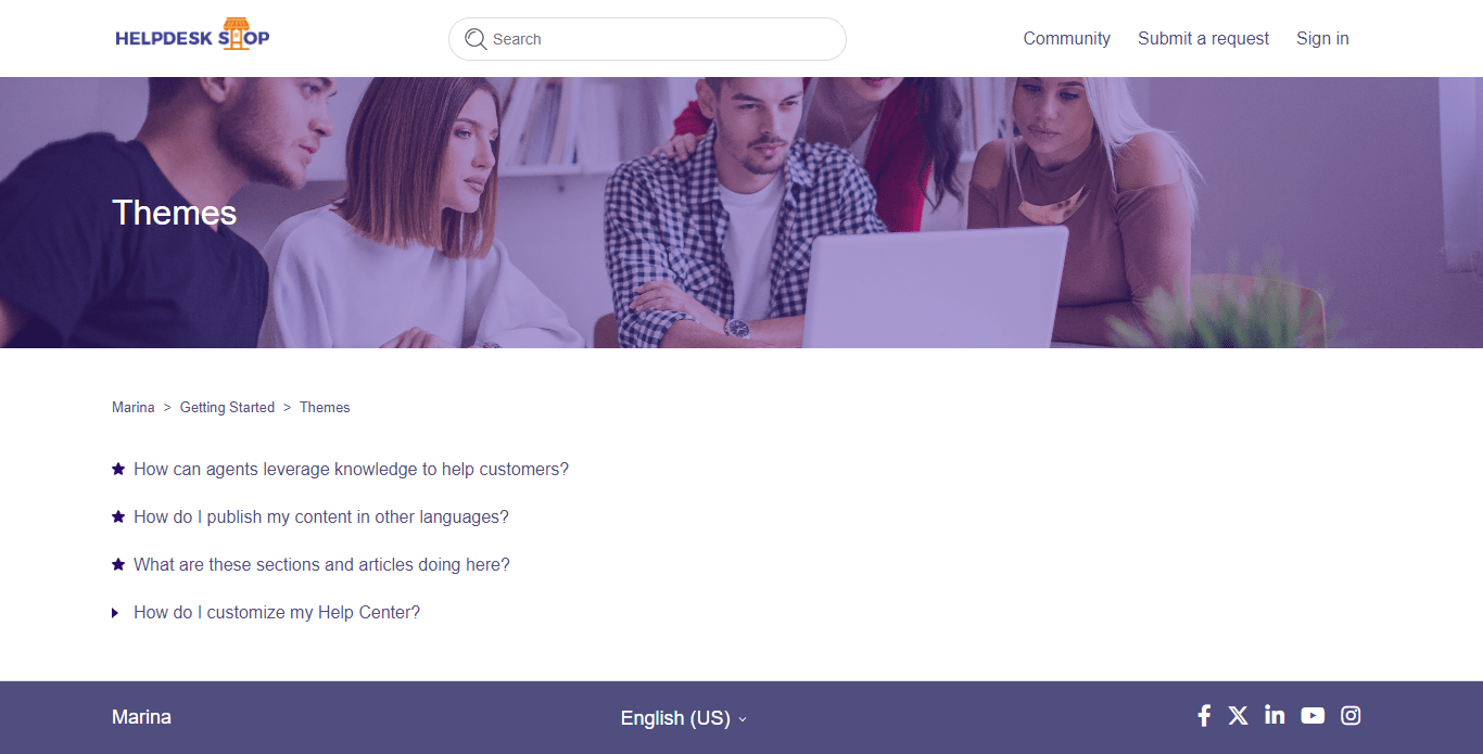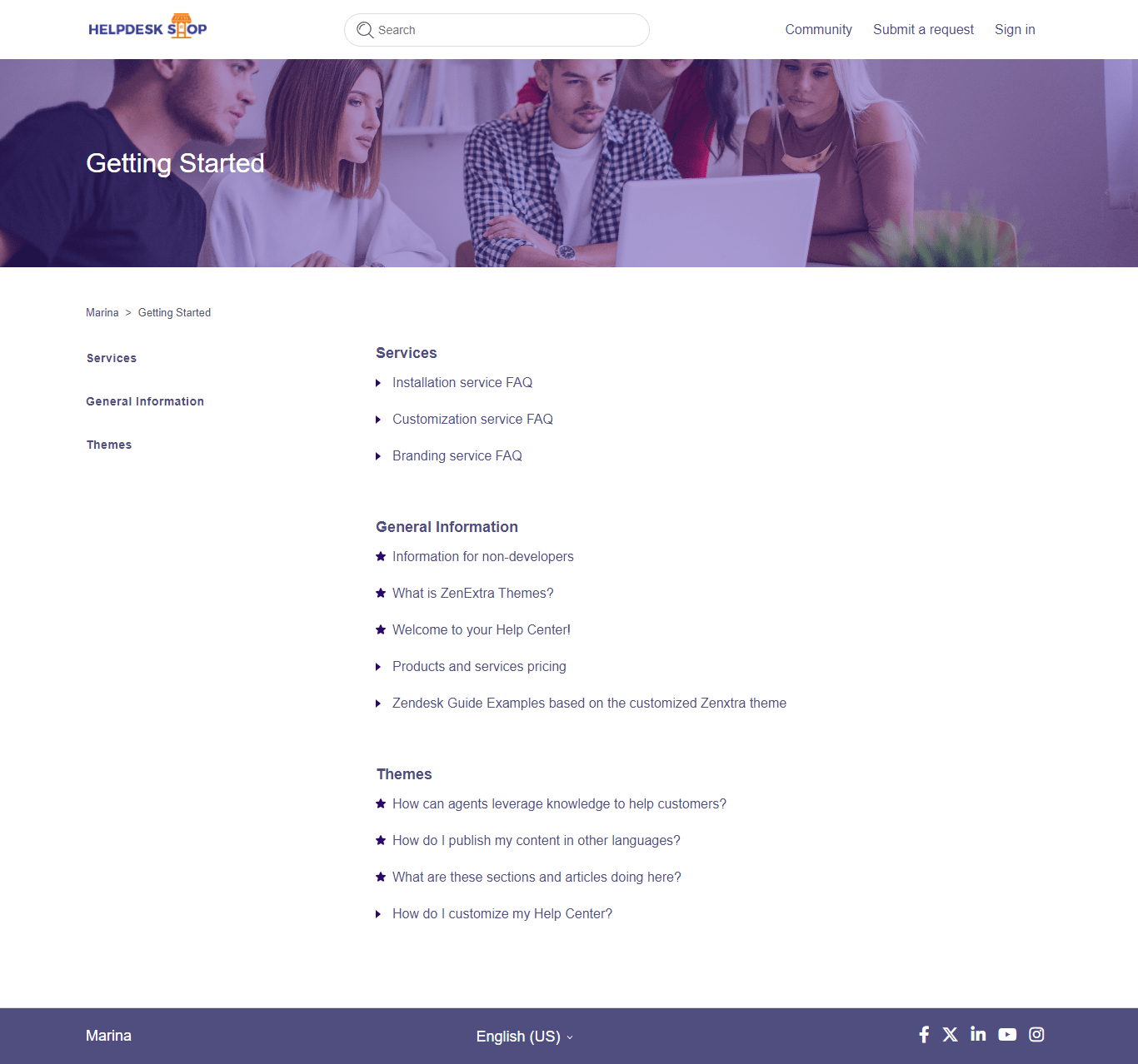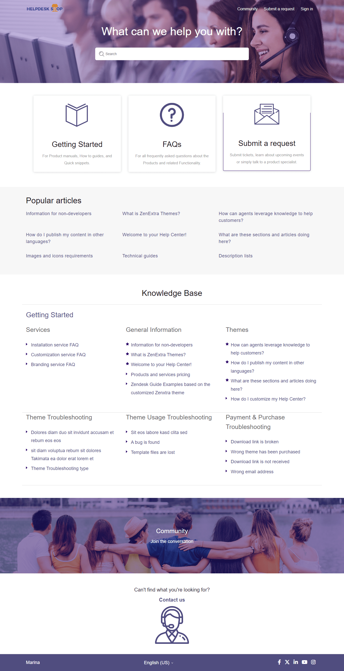 Marina is a fully responsive multipurpose Zendesk Help Center (Guide) theme. The theme is a perfect balance between style and performance. All the elements of the help center are arranged in a way that keeps navigation super easy.