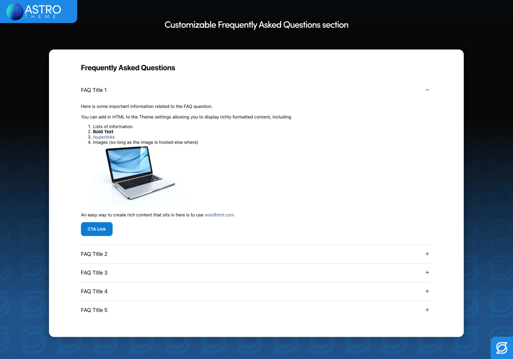 Homepage FAQ Accordion: Answer the simple questions at speed on the Home Page! Set up to 5 questions and answers. Each answer can contain a custom link, body content and will accept formatted HTML.