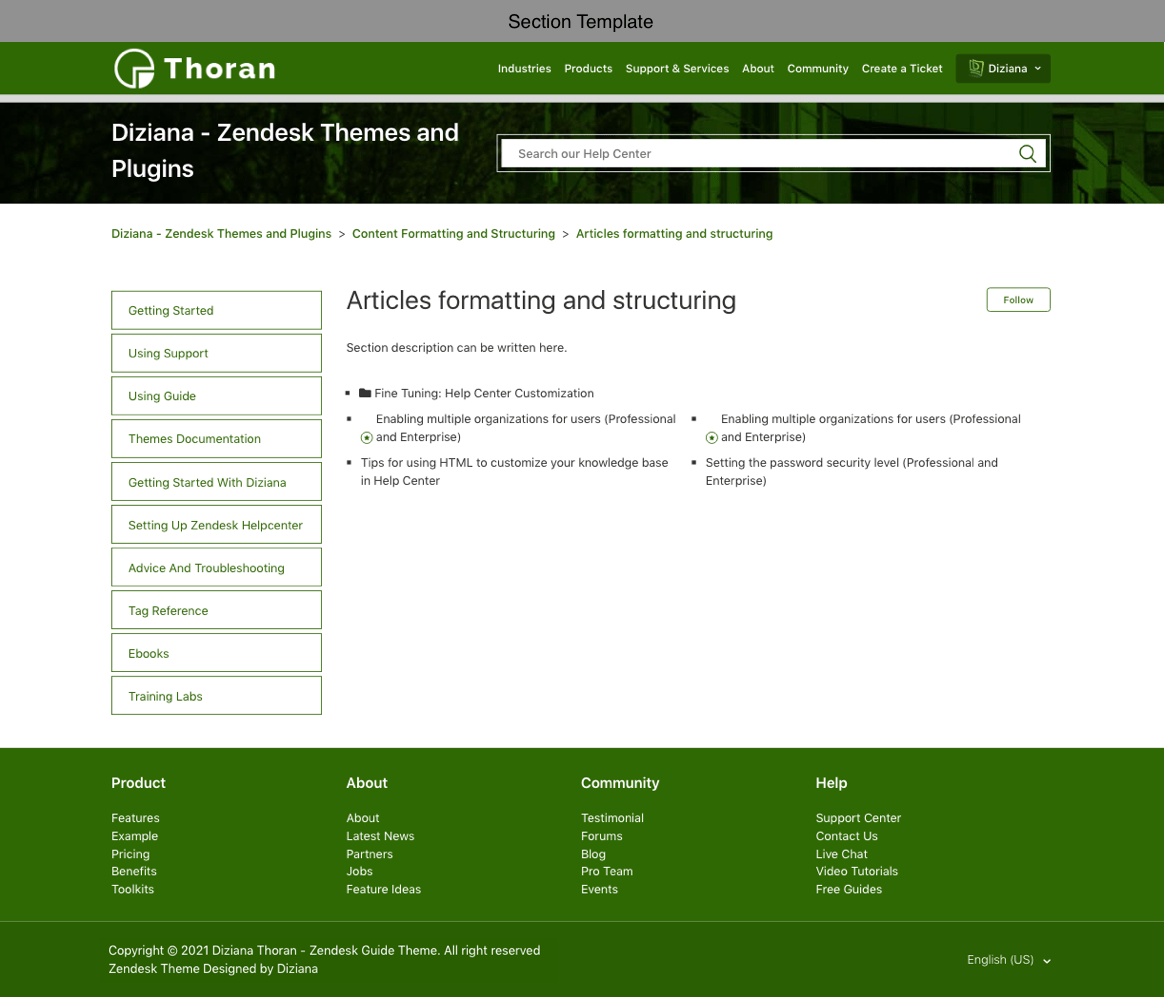Diziana Thoran is a fully responsive Zendesk® Guide Help Center Theme (templates). It can be used by all kinds of organizations -- Technology, Education, tours & travel, Food, Startups, IT, Medical, Construction, Builder, Marketing, Startup, Fashion, Government, NGO, Not-For-Profit - Companies, Business, or Organizations.