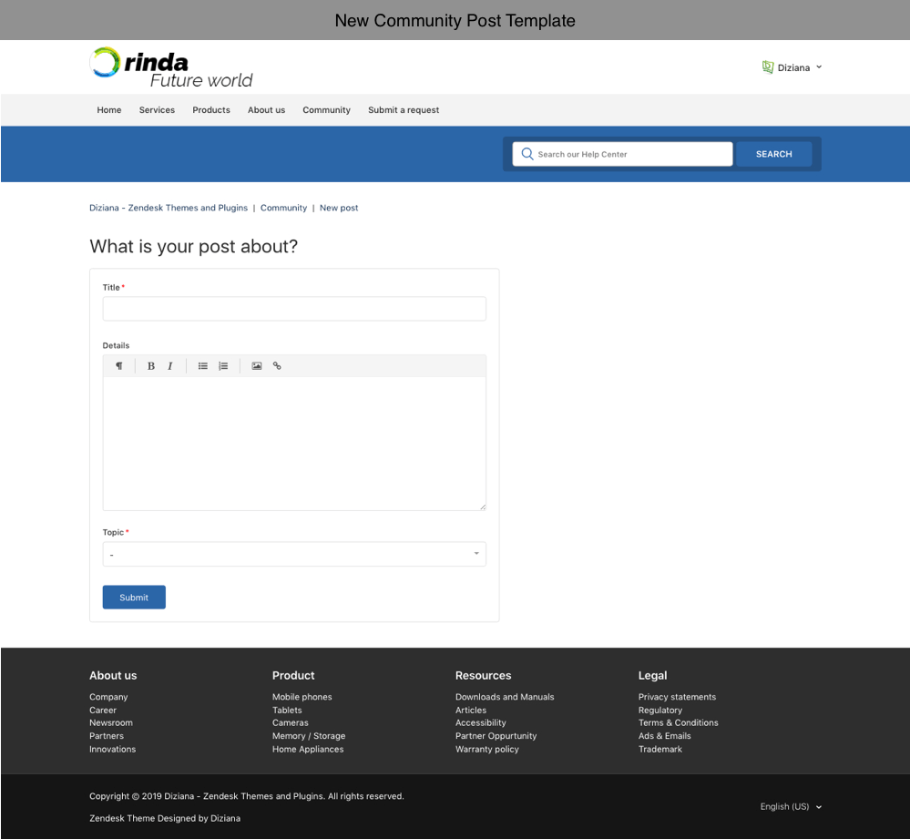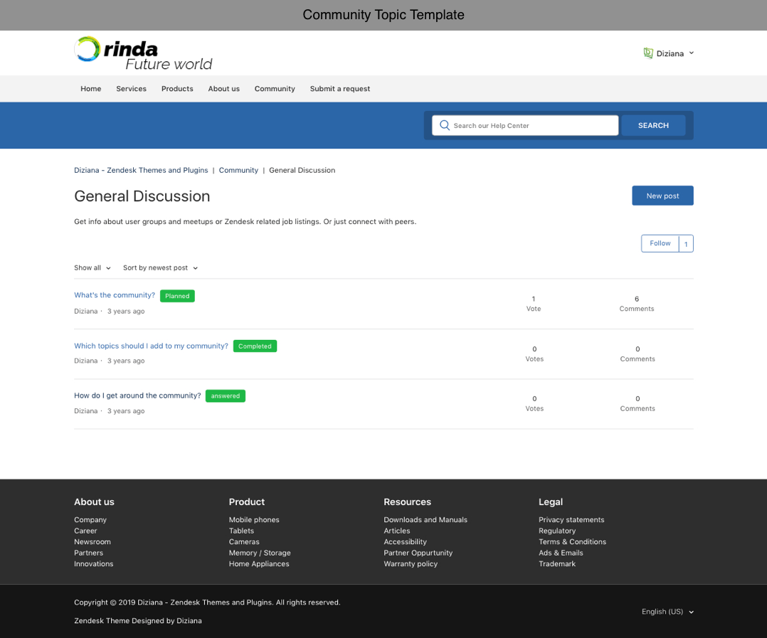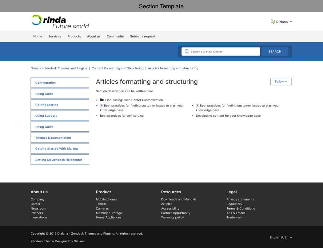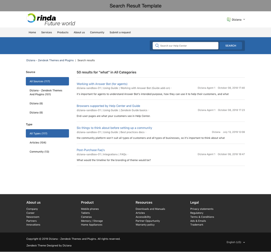 Diziana Rinda is a fully responsive Zendesk® Guide Help Center Theme (templates). It can be used by all kinds of organizations -- Technology, Education, tours & travel, Food, Startups, IT, Medical, Construction, Builder, Marketing, Startup, Fashion, Government, NGO, Not-For-Profit - Companies, Business, or Organizations.