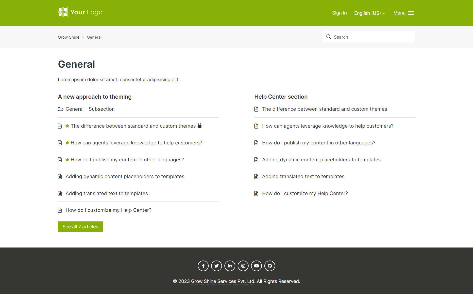 Also, Green comes with several setting options that will help you improve the user’s perception of your help portal. The theme options are user-friendly and require no special knowledge, adding value to a beautifully responsive Zendesk guide theme.