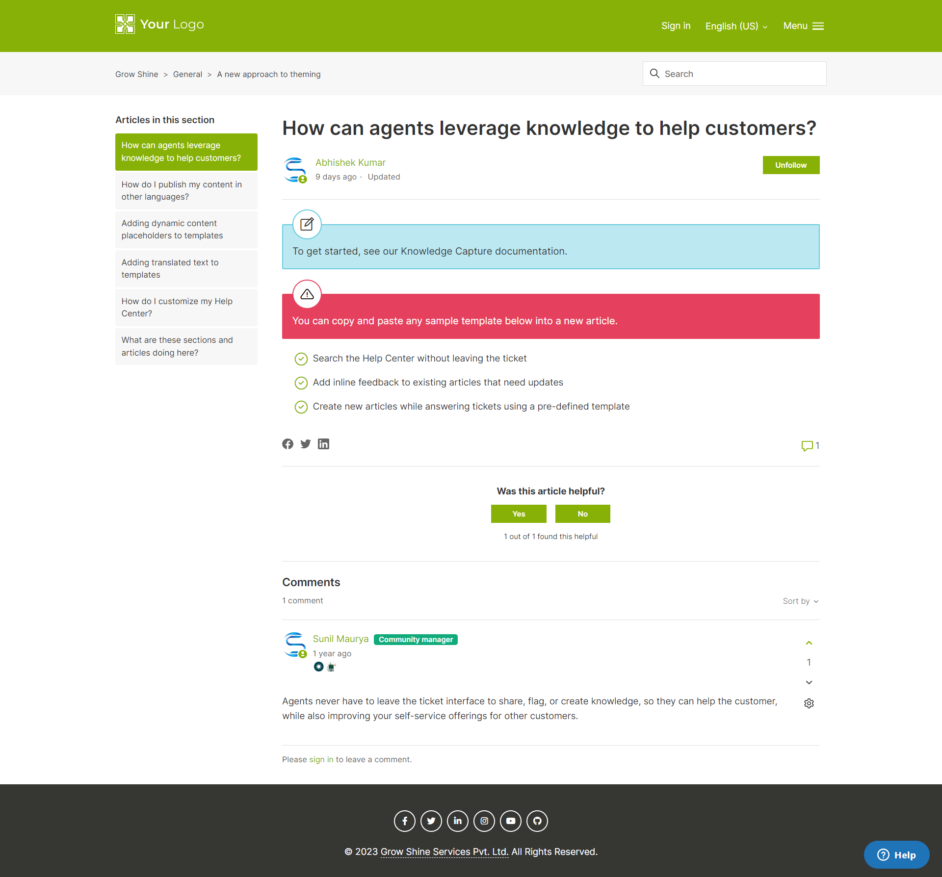 Supercharge your Zendesk Guide with Green - A Powerful Multi-concept Zendesk Theme for all agencies. Built with Zendesk’s Templating API V4 and Generative answers (AI-search).