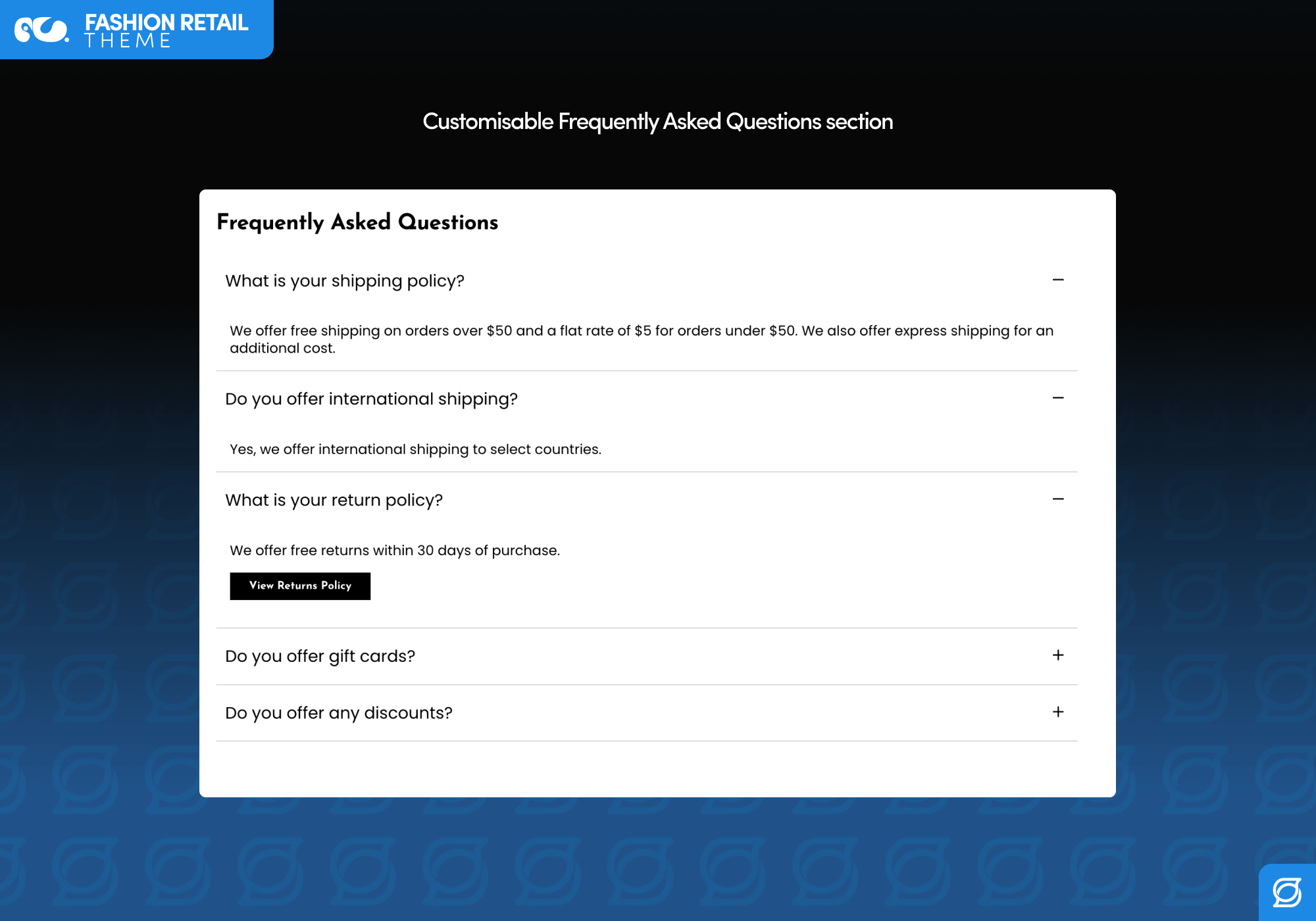 FAQ section: Manually set the most popular questions and answers in an easy to use section. Each question additionally has a customisable button to link to either an article or external link. HTML formatting can also be applied to the content to show rich formatting.
