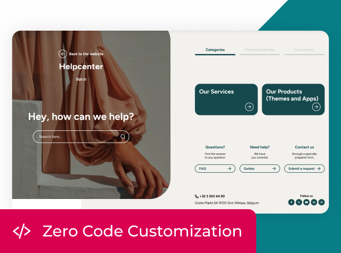 Play around with different styles and designs to reflect your unique identity. Adapt colors, images, icons, fonts, and logos: our Zendesk theme offers easy help center customization without coding.