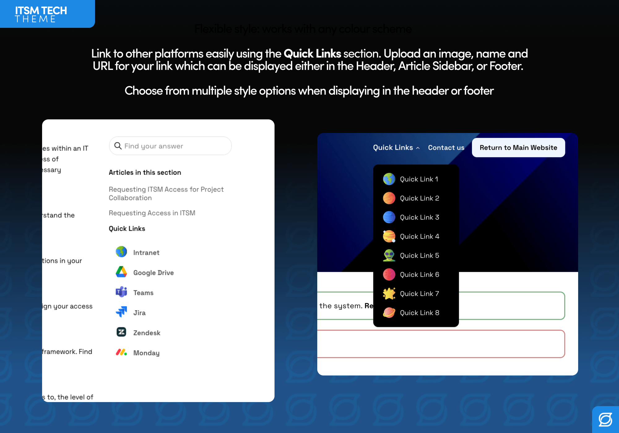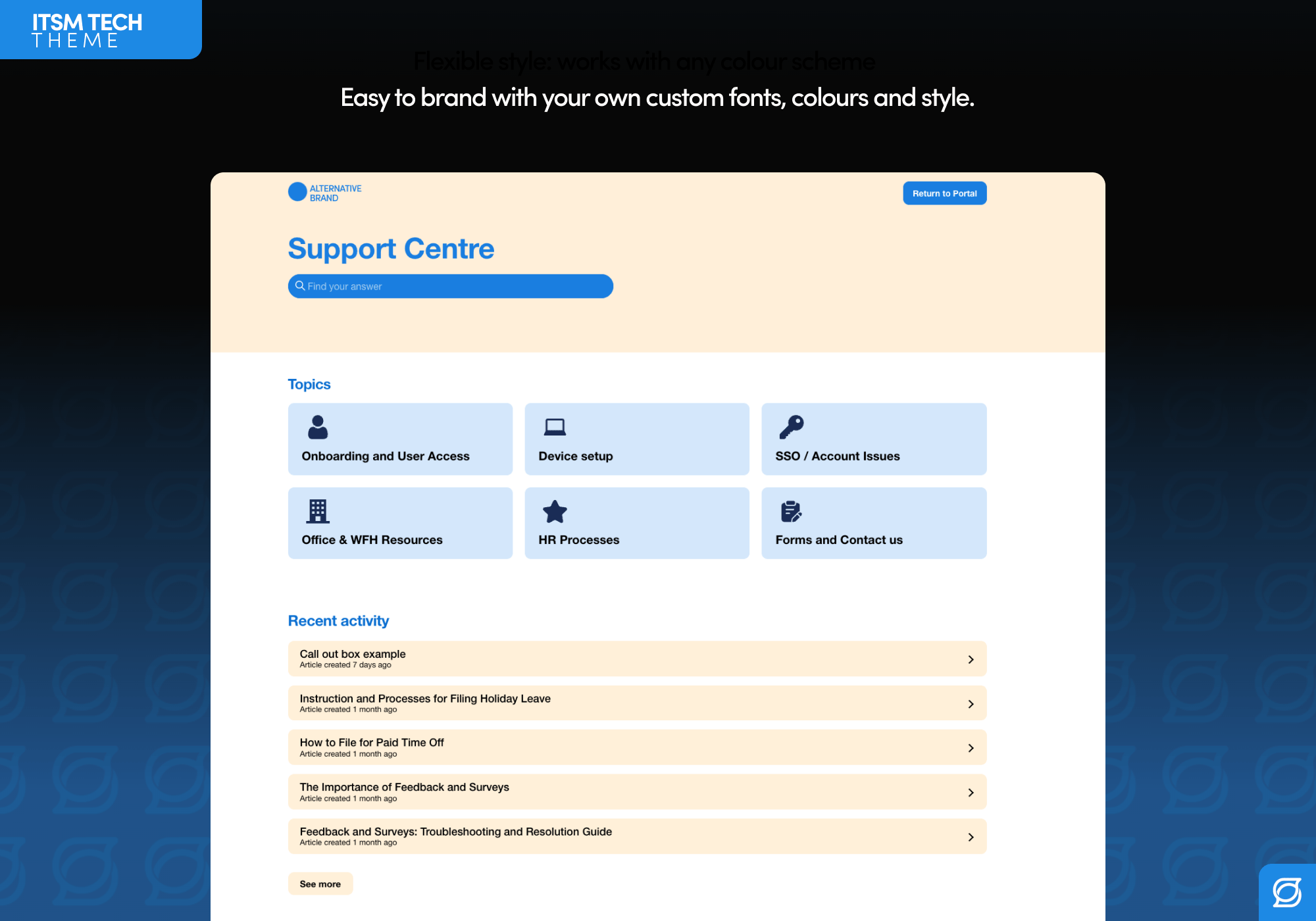 Create an amazing on-brand employee experience (EX) and customer experience (CX) for all your internal and external tech users. ITSM Tech Theme delivers a great self-service portal experience that’s quick and easy to install with no-code easy configuration.