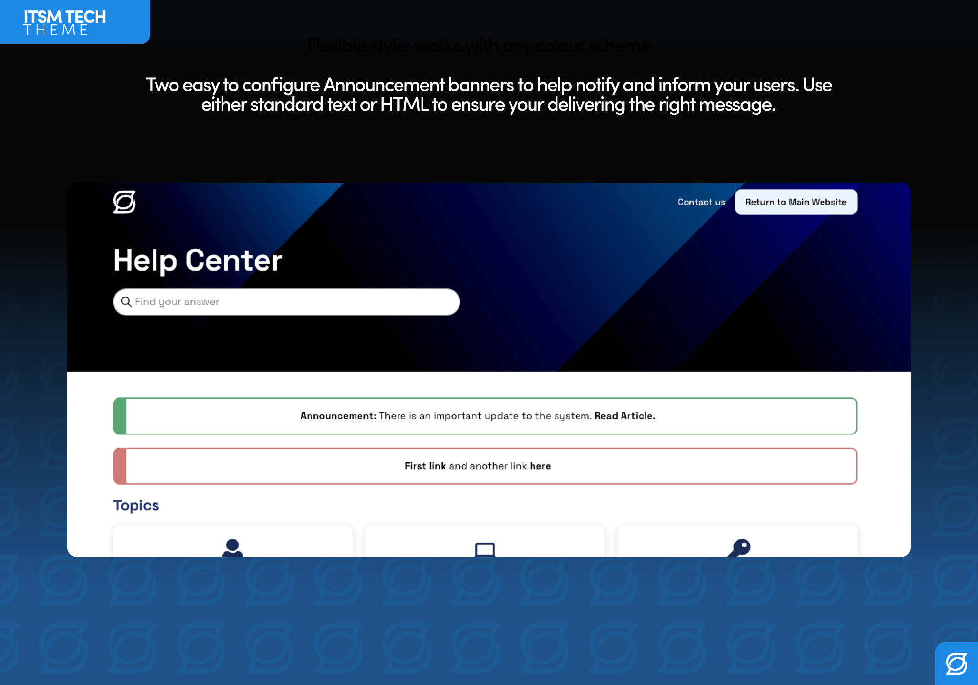 Alert your users to critical outages, upcoming operating hour changes or critical articles with Announcement banners. Choose from either a simple banner or one which accepts HTML input allowing rich formatting options.